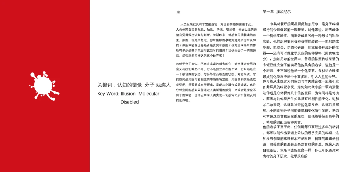 日常生活中,人们处于宏观世界中,对事物的尺度、感知有一定的定义与记忆,而在显微镜下的微观世界却未曾探知,认知错觉性设计第一组创新尝试,即是将人的视角带入微观世界,通过文字表述,人观看着并通过想象各种感知体验认知一个全新的世界。在微观世界中,分子的空间定义与我们对空间的定义截然不同,我们所理解的人类空间主要就是一个场所,受到形态、规模、氛围、时间的影响。对于人类来说,对于空间的感知都是通过丰富的感官体验:视觉、听觉、触觉等,而对于一个蛋白分子来说,它并不是独立存在的个体,它没法像人类一样感受一个完整的场所,它永远处在一个被包围的状态,与另外东西相互牵连。对它来说,它的空间是周围与它相连的事物所决定,周围的物质是柔软或坚硬,是紧贴或有所距离,是能与之融合或是破坏。也许它对空间的感知只能通过人类所谓的触觉,或者是完全不同于感官的体验。
