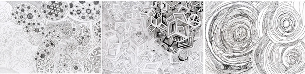 《真实的虚构》这一组黑白线稿,用最简单的方式表达小说中主人公在现实世界中进行试验的场景。用最抽象的方式表达最贴近真实的场景,试图再次将观者带入认知的错觉。当熟悉的场景以变相的方式展示时,观者又往往会害怕承认现实。