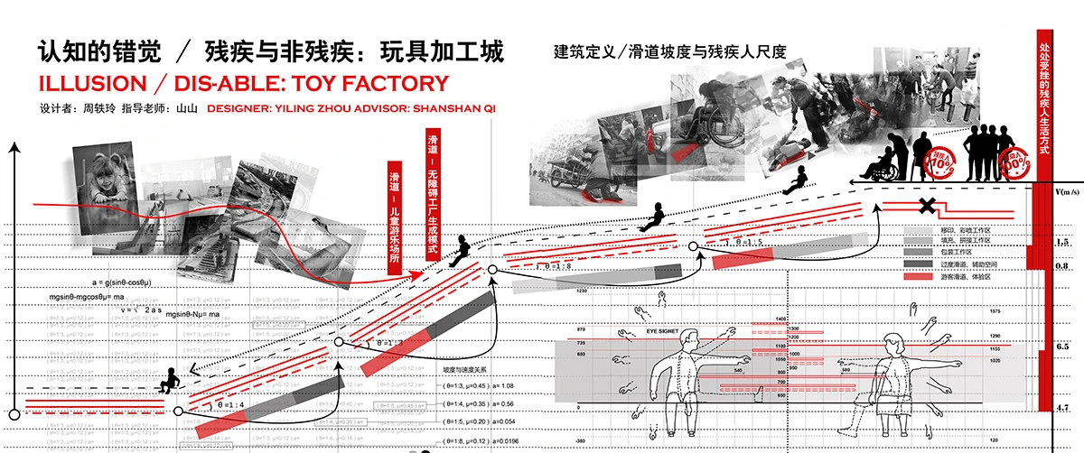 人们在新鲜事物的认知活动过程中,会因为在感官以及对大脑中以往经验、记忆的提取和整合等一系列过程中产生误差和错觉。本次设计重点在于认知错觉的探讨与展现,通过微观视角、平行视角、三维视角几种维度的变化作为认知错觉的依托对象,讨论从非人-微观食物角度到平面维度,再到人-三维空间认知错觉的形成,并通过艺术形式将“错觉”表现出来,以供观者在欣赏创新艺术的同时反思错觉形成的原因。最终将认知错觉性设计应用于建筑设计中,通过连续的滑道空间搭建无障碍的残疾人工作界面,同时使非残疾人在内以同样方式运动,以消除残疾与非残疾的差异,并令人反思对残疾人的认知态度。
