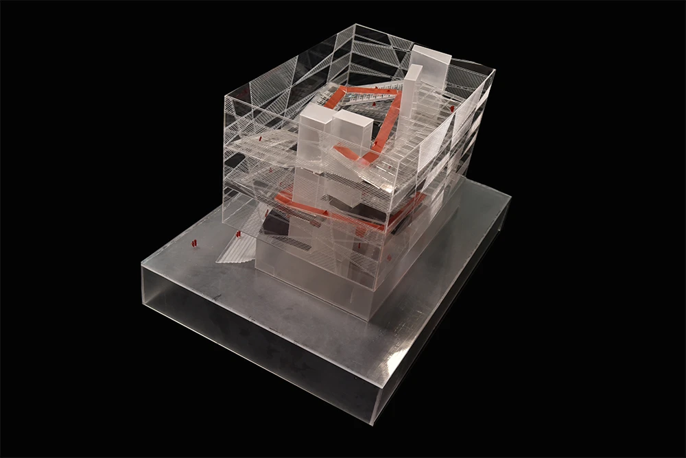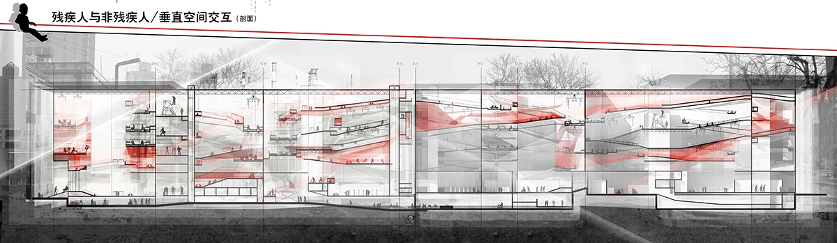 建筑空间设计以残疾人感知特点,独特的行为方式作为推动建筑生成的理论,试图建立残疾人与非残疾人的交流界面。以残疾人的身体尺度作为设计参照,以残疾人特殊的活动尺度作为建筑空间的尺度设计残疾人的工作界面。通过“倾斜”这一点来控制整个建筑设计。一是由于倾斜的空间可以使得下肢残疾的人自主移动,并且能加快生产过程中行动的速度。二是由于倾斜的空间会使人失去的对方位的判断,产生所谓的“错觉”。而其中此时的“倾斜”即是指滑道。建筑中运用到四种滑道坡度与工作活动的关系,滑道的组合都根据与坡度适应的工作于人体尺度呼应。倾斜的交通空间颠覆了“正常人”的前进与后退,上升与下降的移动方式。虽然残疾人的运动方式灵活性少于普通人,但由于坡道而产生的下滑加速度可以帮助残疾人更好的活动,更好地提高工作效率。通过连续、分割又交错的滑道空间,消除“残疾”与非“残疾的”之间的界限,重新定义“残疾人”的社会认知。