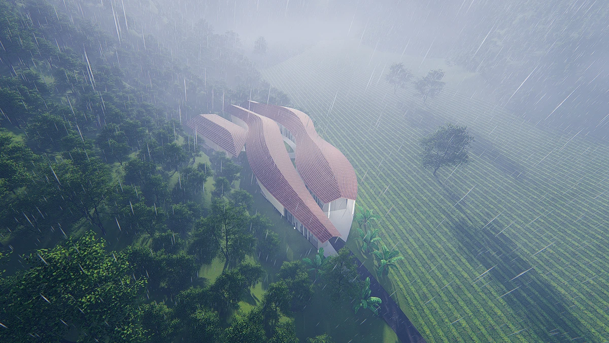 干栏式建筑多以防潮而建,长脊短檐式的屋顶以及高出地面的底架,都是为适应区域多雨需要。此处建筑形式多以山墙顶端三角区域直接开敞的做法,用于采光和通风。陇门古有明火炊事,平时也会将日常所需柴薪堆放于山墙脚下。设计延续当地建筑肌理山墙-枝干-柴薪-青石地面,层层「界面」过渡后,外立面的概念被弱化,建筑和自然环境之间的界限变得模糊而不确定。