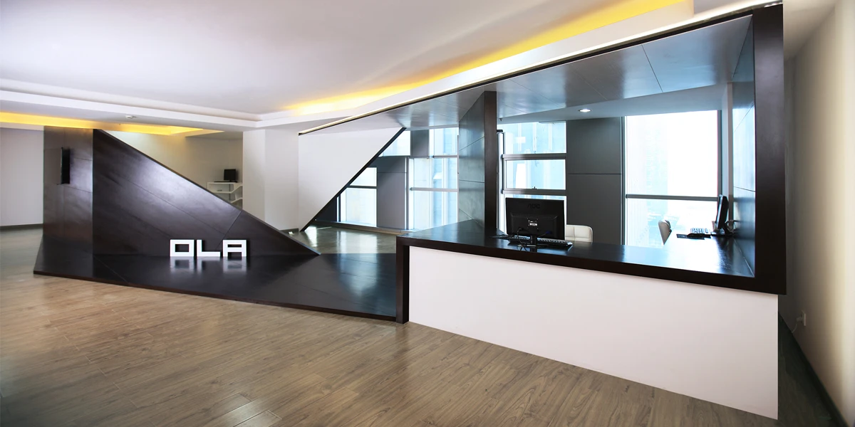 本项目是OLA科技总部室内改造,其需在一个矩形的空间内合理布置接待、展览、参观、洽谈、会议、等多性功能空间。设计过程中,用木板拼接表现室内空间的翻转动势,使室内空间成为一个主动指引流线,从入口到前台再到产品展区再到会议室,其过程自然而然地形成,与办公区域分隔开来。为业主提供一个开放,连续且拥有各自独立性的开放空间,并探索新的办公方式。