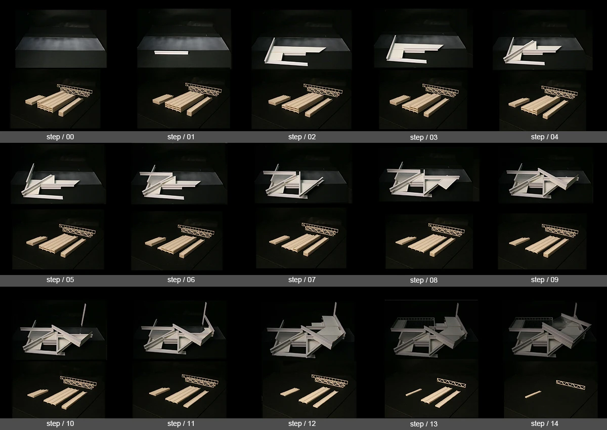 利用二维平面、三维模型和实体模型对结构搭建的每一步进行清晰呈现。直观展现复杂建筑下的简单搭建逻辑。