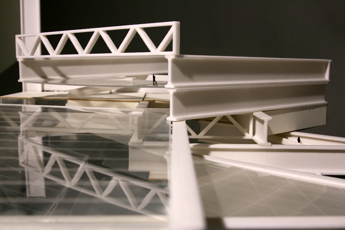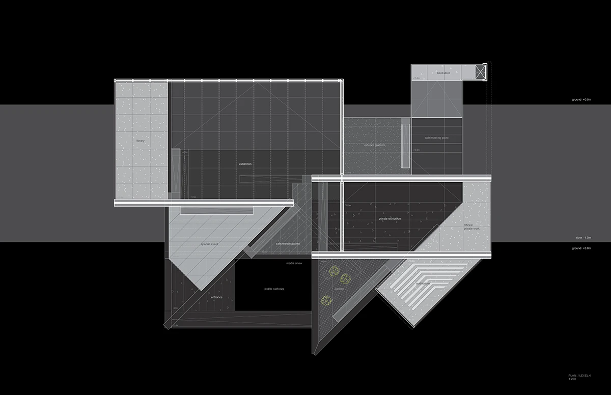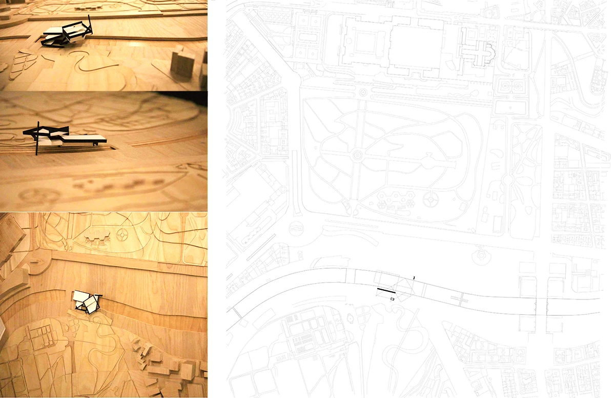 项目基地位于西班牙马德里市中心,横跨河流。设计将底层架空,似乎悬浮于河流之上。在用地紧张的市中心,架空底层的设计将河流及其两岸的地面空间归还于城市,创造更多公共绿地,人群可在此自由穿梭,欣赏河岸的风景。建筑内部设置展厅、会议室、图书馆、咖啡厅等社交空间。