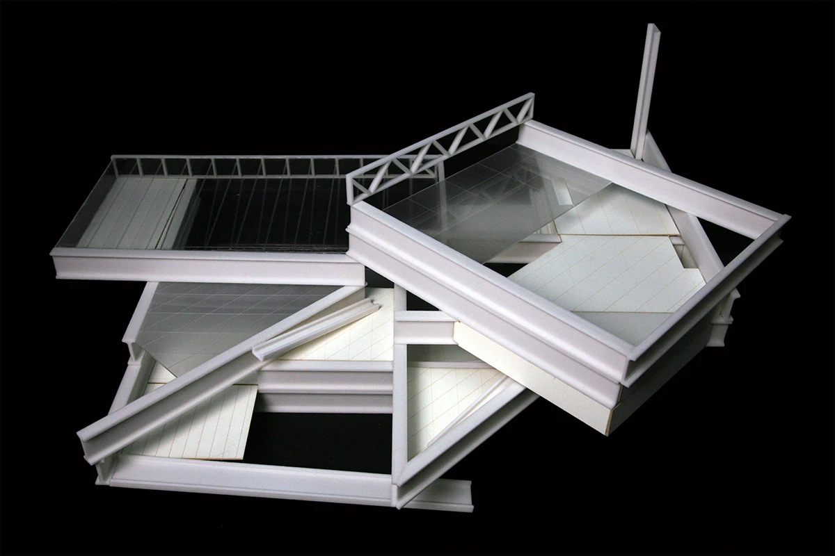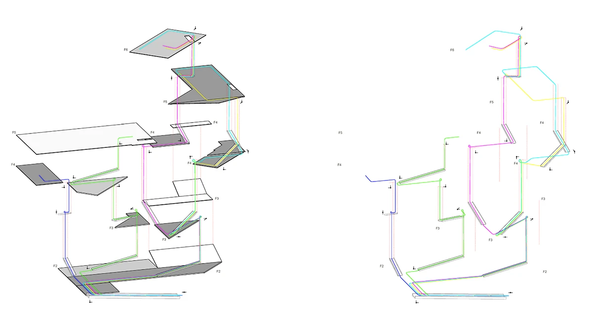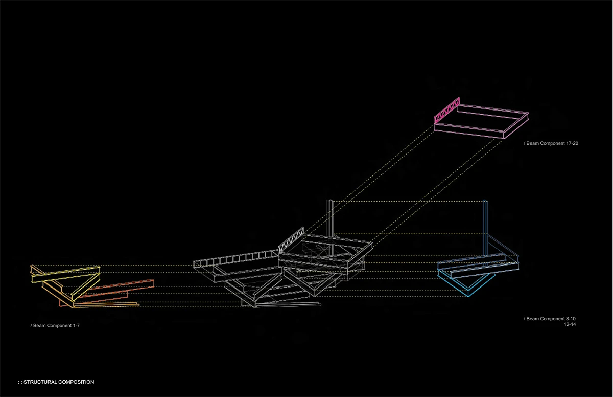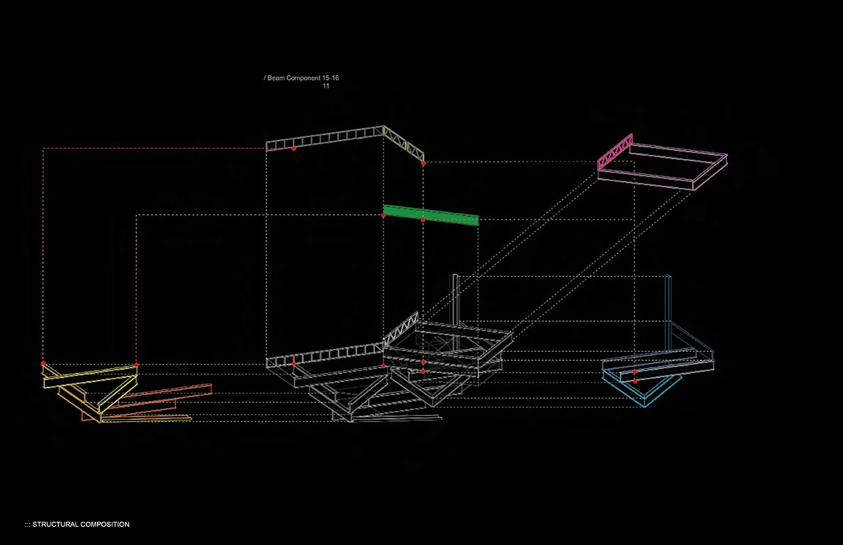 值得一提的是,支撑整栋七层楼建筑的落地部分仅仅只有一根水平工字梁、一根垂直工字梁和一个电梯间这三个落地点。搭建前,设计者对各结构构件与连接点进行过精确的受力计算,每一根梁、每一个连接点、每一个搭建角度都至关重要且必不可少。这是一个寻找每根梁之间相互关系的过程,就像写字时每添加一笔,笔画中的关系都会幂数式递增。在搭建过程中,超大的50m梁(部分直接成为墙体)一直转向和错位,寻找结构上新的平衡,空间也随着梁的增加而演变和延伸,使空间可能性最大化。
