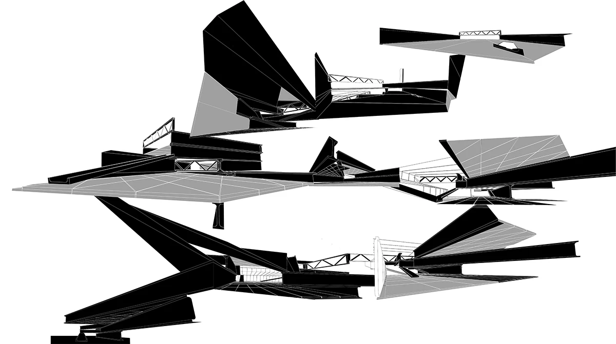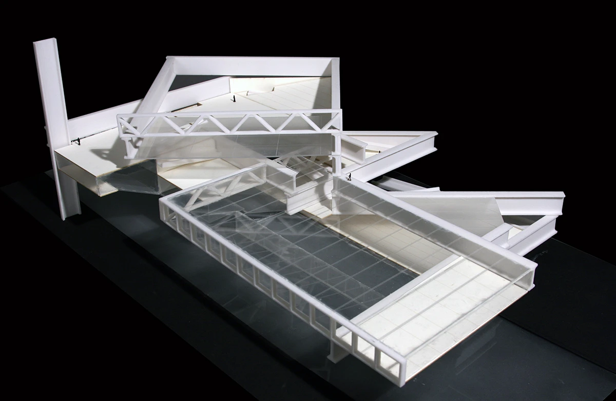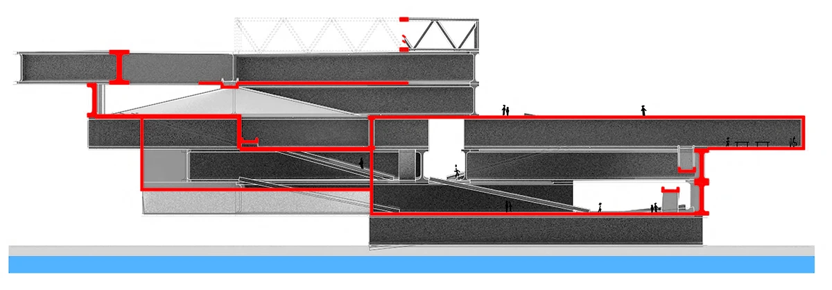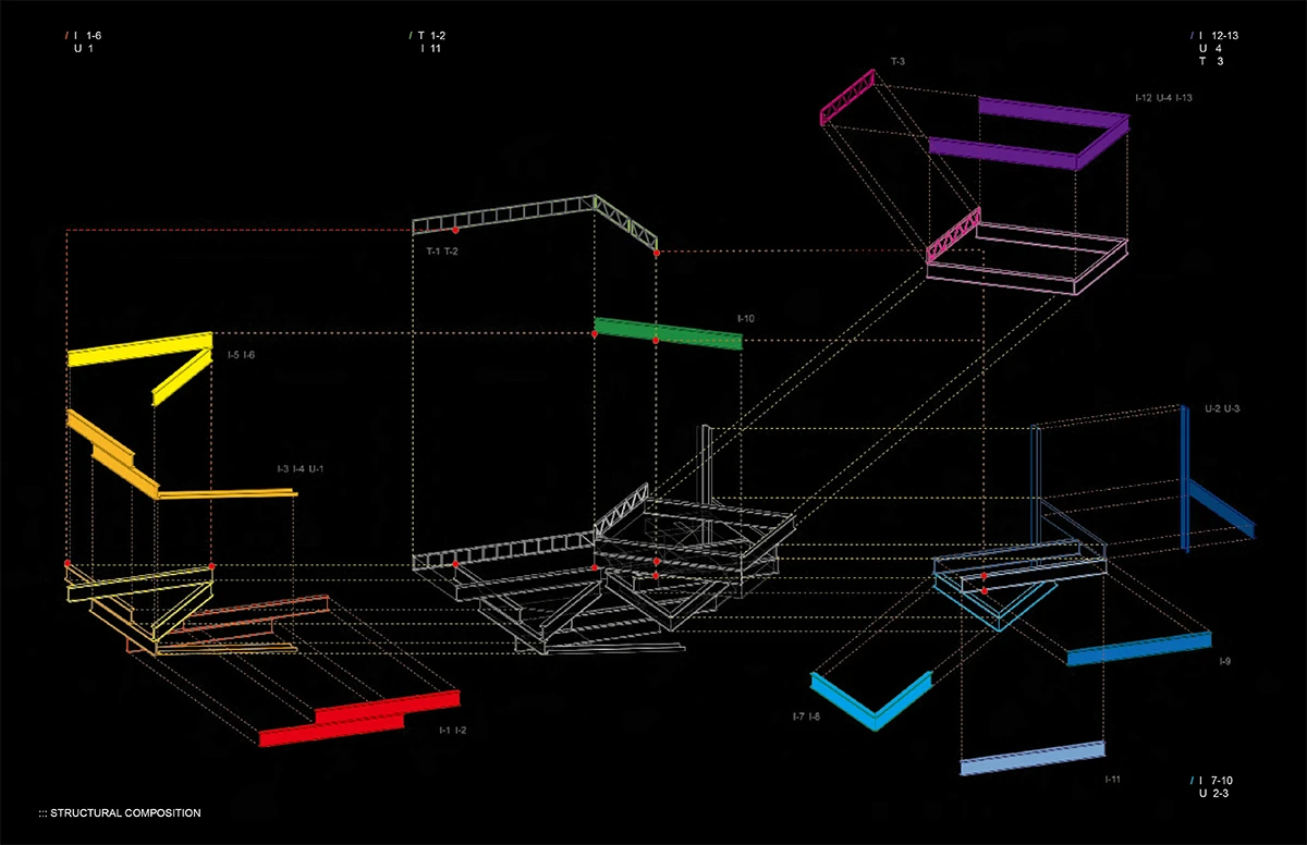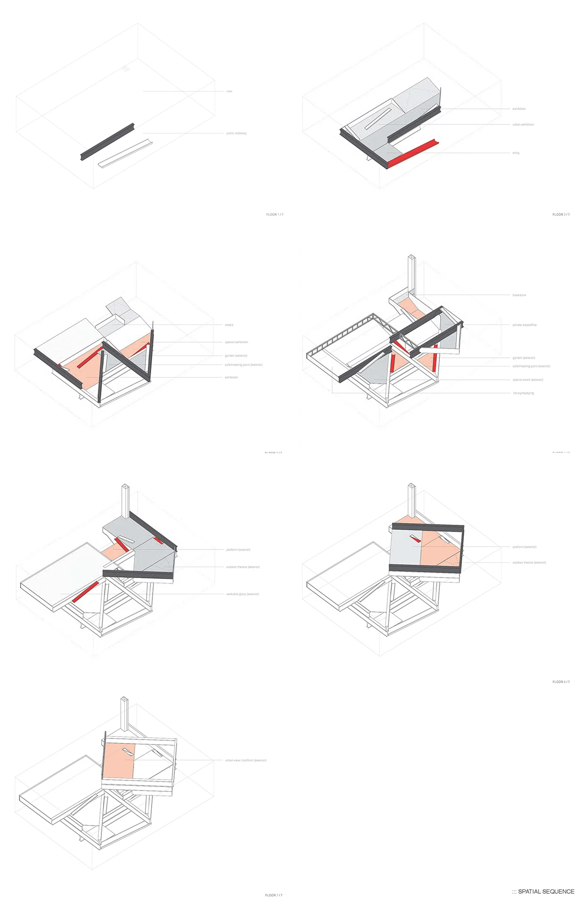 每一层的工字钢、U形钢和桁架既作为该层的结构体,又是围护的一部分,同时对承接上层荷载与平衡上下层受力起作用。结构的布置形式决定了空间的开放、闭合、平行等关系,结构塑造了空间形态,空间将因每层结构体不同的布置形式而丰富。在此建筑中,结构还暗示了人的行为路径,对人群流线进行有意识的引导。从地面层到七层,跟随结构平行、收缩、交错、开放的引导,人群将经过展览、咖啡厅、花园、图书馆、书店、室外剧场、露台等功能空间,起初只能看见河岸的风景,随着行走路径的穿梭,室外景色渐渐消退,再看见的就是室内丰富的空间变化。步移景异,当最终到达顶层露台时,视野豁然开朗,河对岸的古堡与马德里的城市风貌也将尽收眼底。