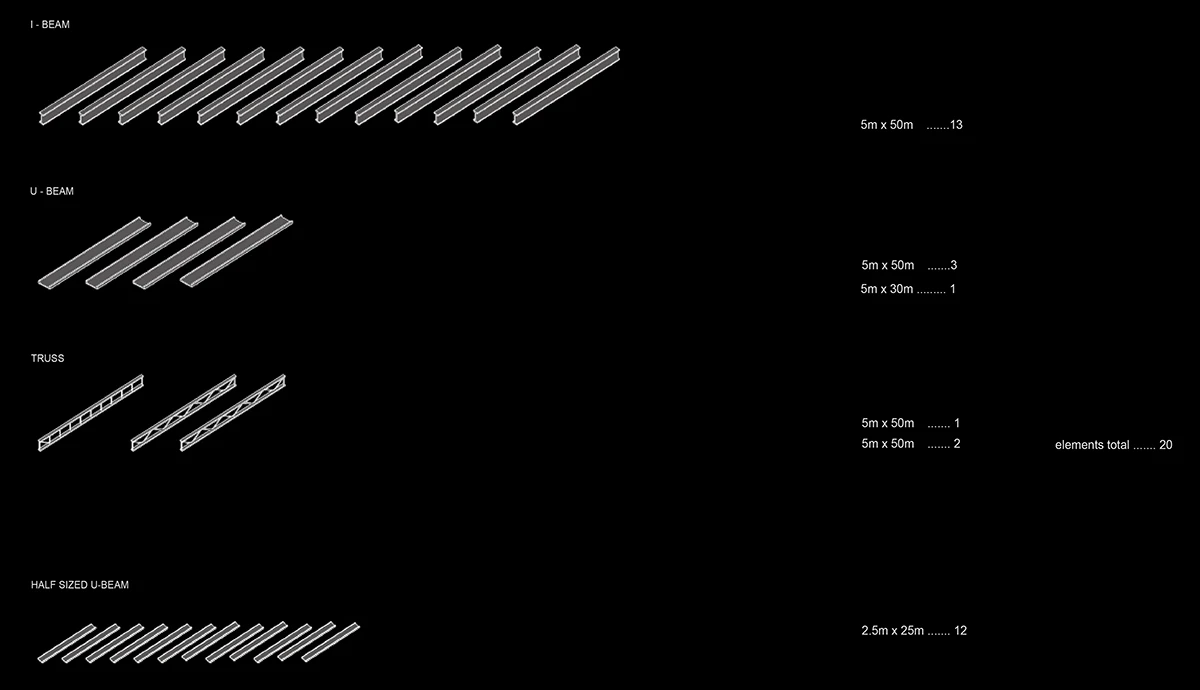 我们相信建筑当为人类提供美好的生活场所和优质的生活品质,其诞生过程不应该是劳民伤财的。本次对建筑搭建的研究,希望对材料及构造方式进行深入探索,以最节省材料、最符合力学逻辑的方式完成建筑的搭建。该搭建项目其建筑的主体结构仅仅由5*50m工字梁及2.5*25m、5*30m、5*50m的U形梁和5*50m桁架总计6种不同材料20件搭建而成。这些材料不需要特别定制,从废弃建筑上拆卸可用的钢材,经过简单加工即可。这么一来,材料的加工、建筑的施工都会大大简化,从而降低建筑的建造成本。