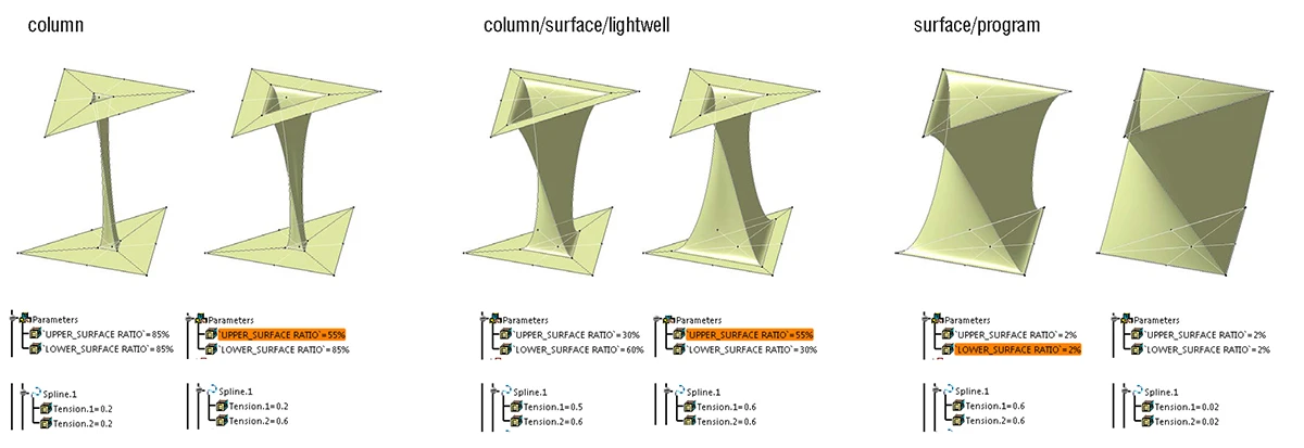 曲面拼合而成的结构提供了形态上的多种可能,只需对控制点与控制曲线稍加偏移,就能在保证形式统一的基础上演变出不同的形态结构。不同的形态除了丰富结构造型的多样性,更提供了不同的空间以满足飞机场多样的功能需求。在这里,我们选取了最具代表性的三种形态来组合成整个飞机场。最原始的是“柱”,控制点2与控制点3靠近水平三角形的中心,形成的竖向结构细长挺立,是造型别致的柱子。将控制点向外围稍作偏移,则竖向结构相较于前者有所扩大,形成了可供使用的“井”和“室”,里面可以置入电梯间、休息室或者办公室。再向外偏移更多,“室”渐渐膨胀成“厅”,而原本柱子的竖向曲面将扩展成具有围护作用的“墙”,而膨胀的筒体也将形成一个扭转的大空间,餐厅、咖啡厅、休息室、商店、行李提取等需要较大空间的服务功能也有了合适的安置场所。因此不需要多余的墙体,仅仅通过参数化方式对结构体进行变异,我们就可以完成集合复杂功能需求并满足大跨度受力要求的飞机场。