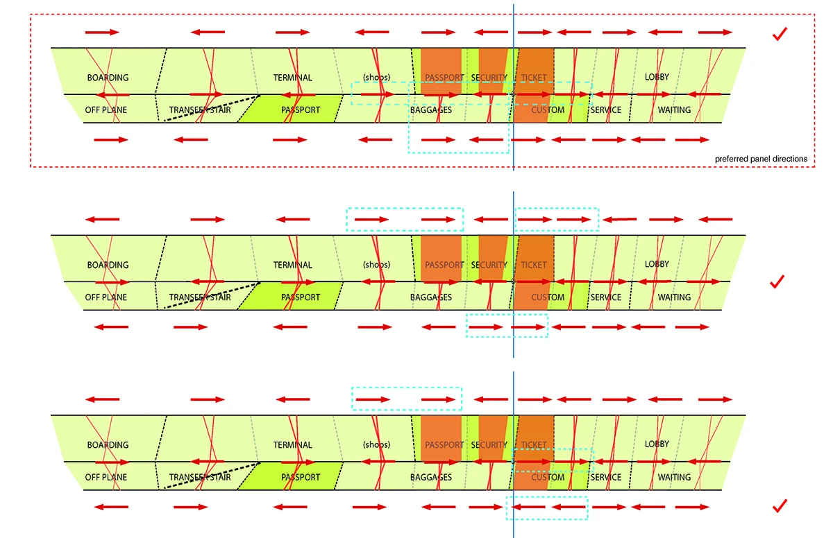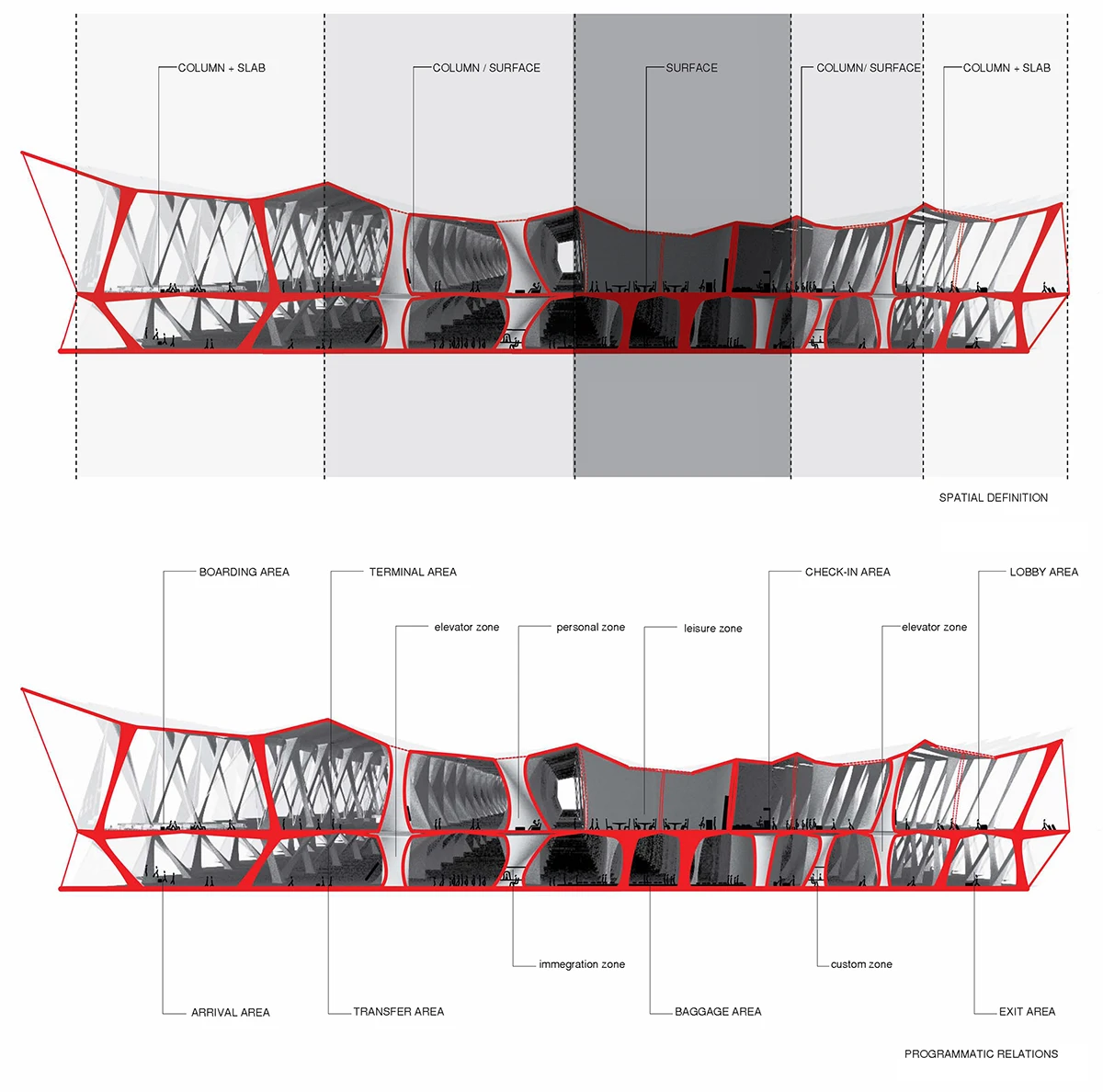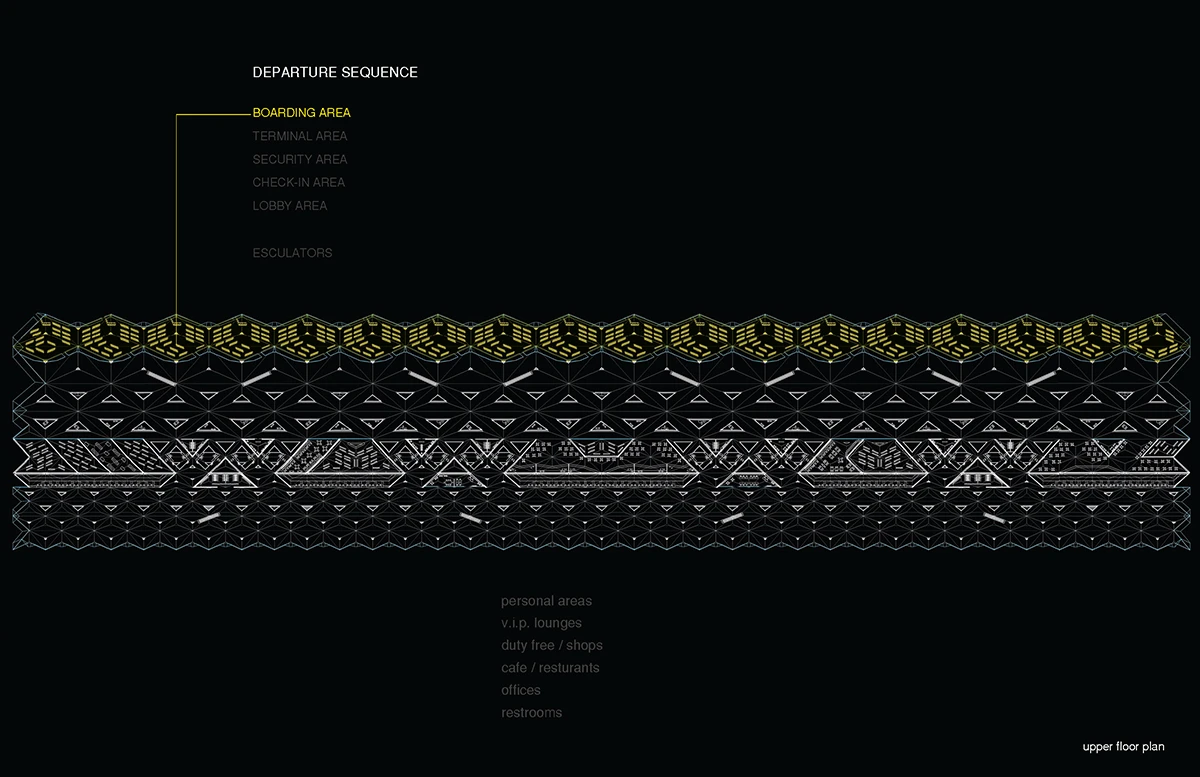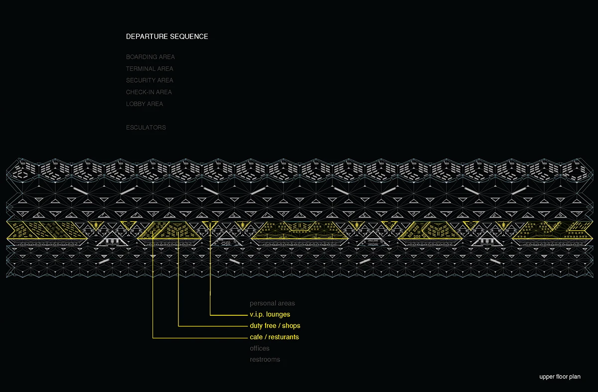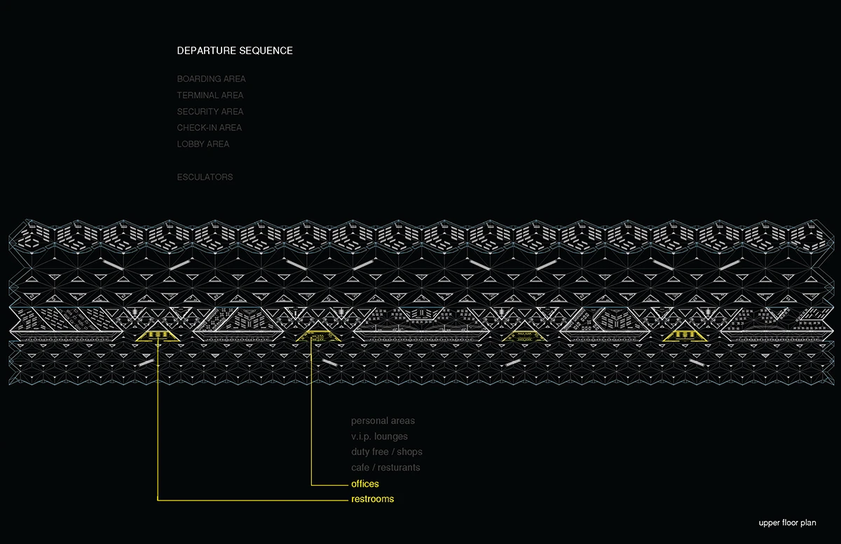 机场入口的空间由细柱形成,宽敞大气,迎接八方涌入的人群。往里走,细柱变宽形成一个个电梯厅满足垂直交通需求。渐渐的,通过形式挤压推动功能的衍伸,由柱子演变成的空间与墙体,在形成登记大厅、休息室等功能的同时,也使得入口开阔的空间向里渐渐紧缩,形成一条条较为狭窄的通道,这些通道恰好作为安检口,将去往不同目的地的人群进行有序的分流。过了安检口,结构单元的墙体又开始向中心缩拢,形成一个个较为私密的小空间,供等待登机的旅客作为休息室或者临时办公室。越靠近登机口,垂直曲面越向中心紧缩,最终在登机口的等候厅处这些结构单元又成为单纯的柱子,为机场留出开阔连通的大空间,以容纳等候在各个登机口的人群。