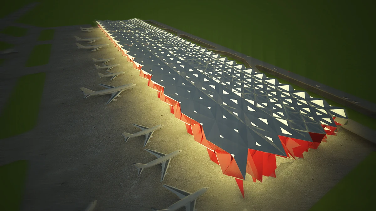 在控制点和控制曲线的基础上生成一个扭转的曲面,三个曲面拼合成上下三角形平面错位的结构单元体。不同于传统建筑结构竖向柱子受荷载作用再将力传递给水平楼板,该结构体由于单个曲面水平方向与垂直方向的错位,将通过水平牵引拉结来传递竖向荷载。这种受力形式相比于错位曲面的竖向拉结受力,可保证整体的楼板水平不弯曲。因为这种结构形式的出现,我们可以抛弃传统的钢筋混凝土,选取低密度高强度的高分子材料来搭建,使机场不再是厚重的庞然大物,而如同一个随时准备展翅翱翔的飞鸟一样轻盈。轻盈活泼的飞机场,也更适合作为呼啸于天际的飞机的栖息场所。