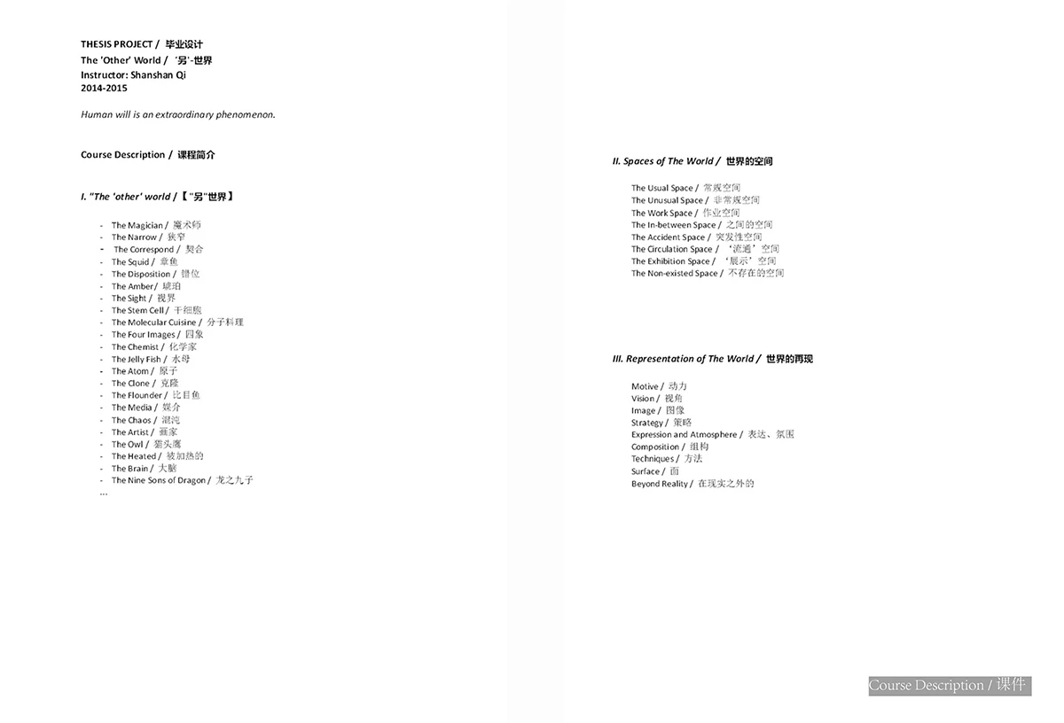 课程第四部分,是安排在春季学期的建筑Architecture。终于到了“建筑”,但不仅仅是建筑,它和其他媒介是交叉进行的,建筑设计作为立场的补充、细化、延伸,此阶段会涉及「“另” 世界」中时间和空间的交互领域。其实同时被挑战的,还有源于「“另” 世界」引发的建筑再现的可能性。那什么是建筑再现?其实它和建筑本身同样重要,在建筑再现的过程中,生形逻辑被重新思考。学生会把个人主观立场尽可能准确地表达出来,去思考什么是建筑。在这里建筑是一种思考方式,而不是一个终结或终点,它会再次反馈给之前的绘画、小说或者装置。