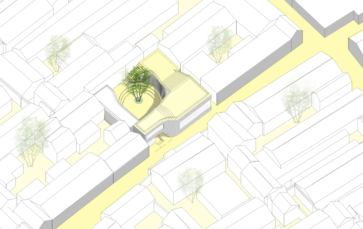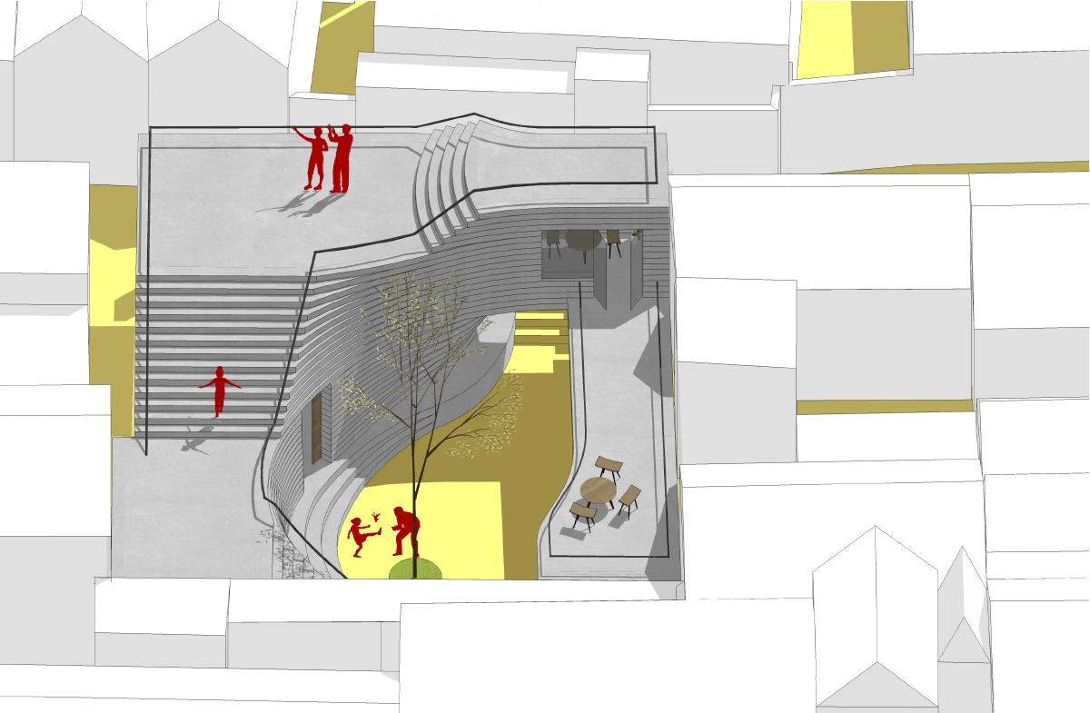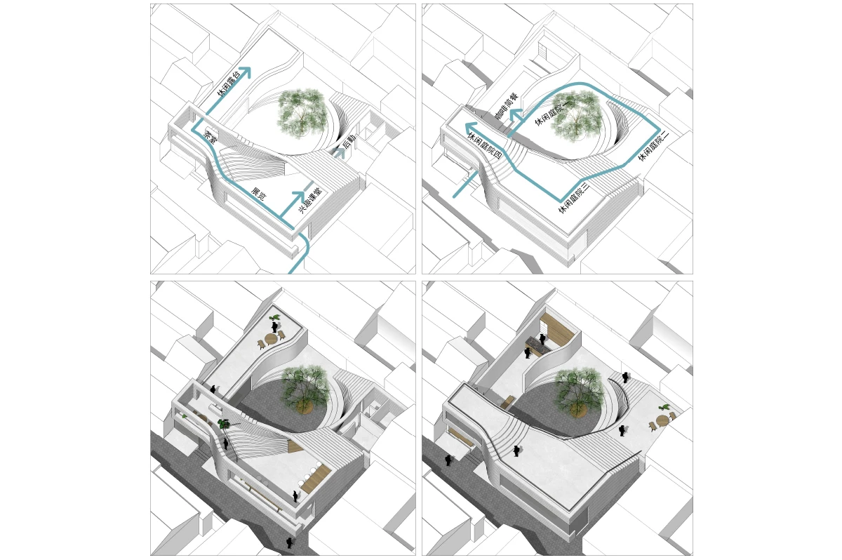 延伸院落系统: 开放的下沉庭院将人们从街道卷入小院,人们拾级而上,会发现地面上的庭院与建筑屋顶组成新的一系列螺旋伸展的院落。