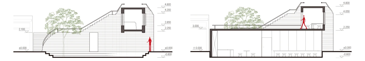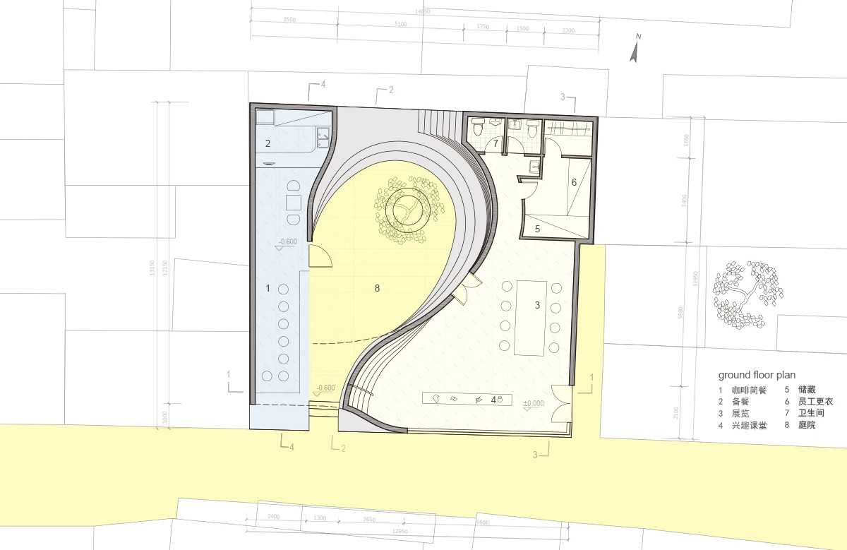 一层平面: 院子与街道直接连接,如同漩涡一般,将往来的人们吸引到一个下沉的小院,并以此为起点,展开一系列连贯的室内外交互空间体验。