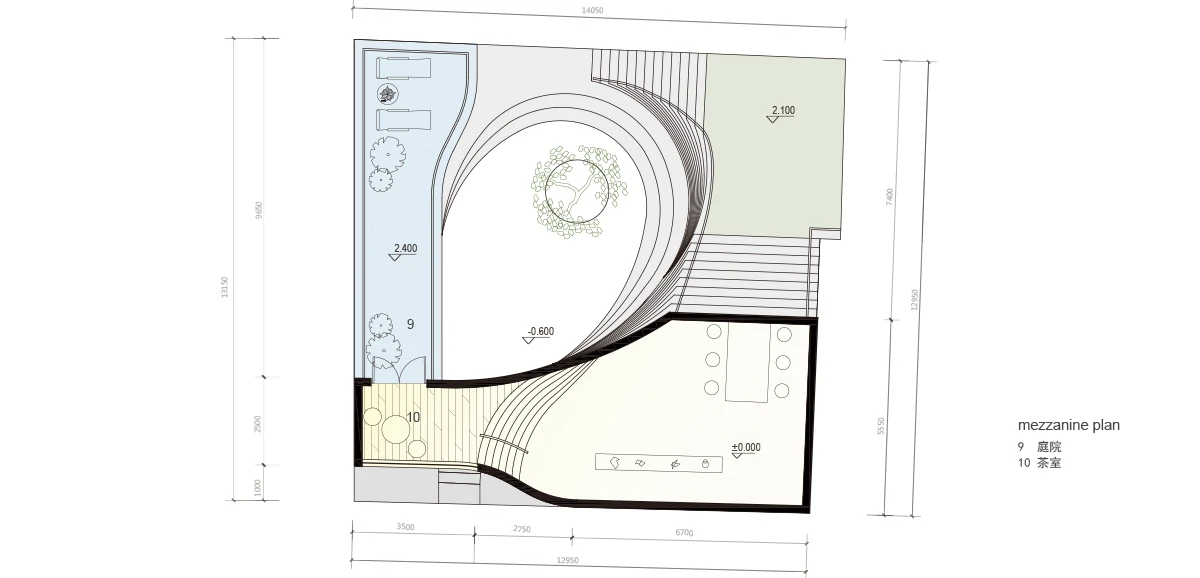 连续院落系统:从街道步入下沉庭院,再经由高低的建筑屋顶,庭院以螺旋形分布在从低到高的流线上。整条流线处处有停留的庭院节点。