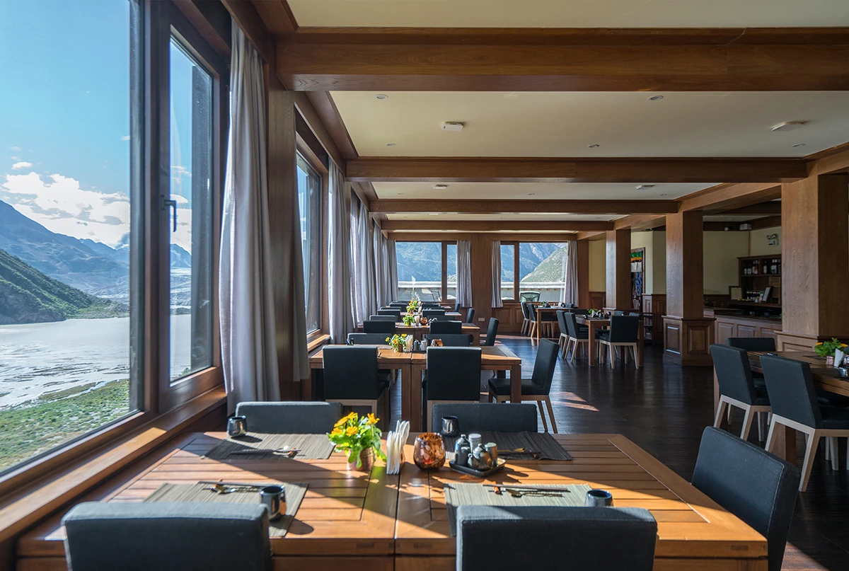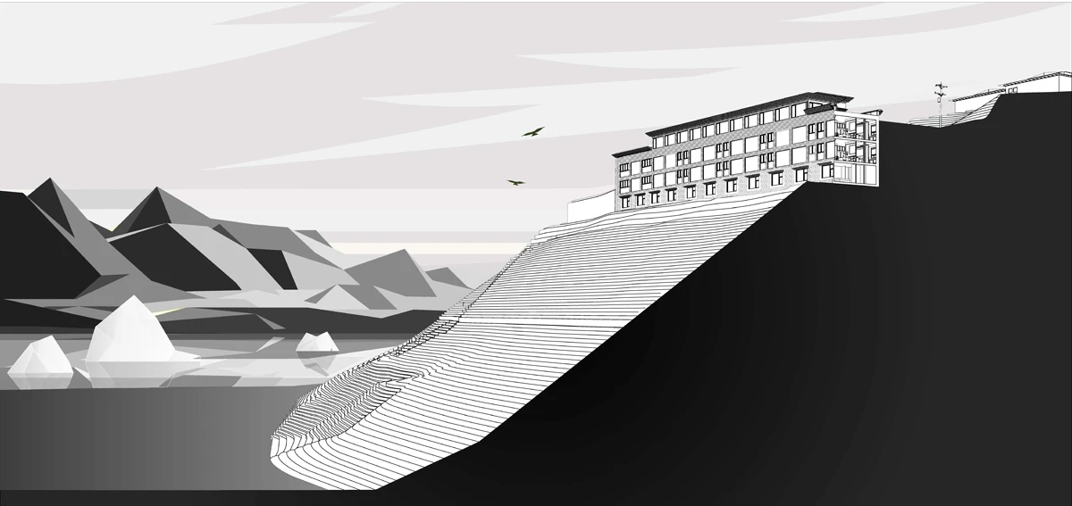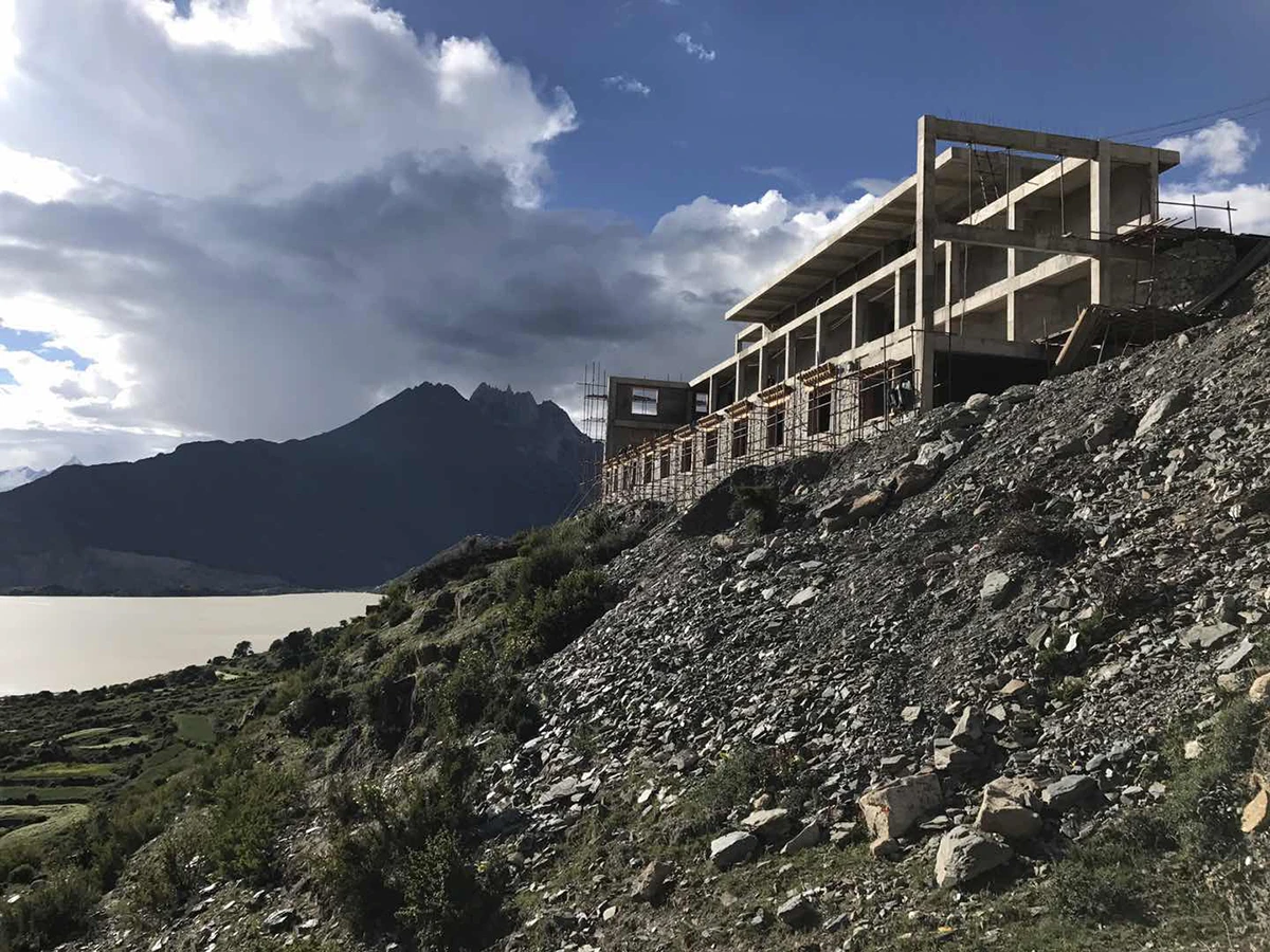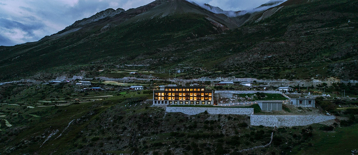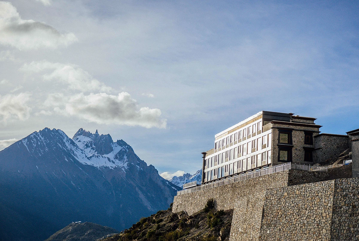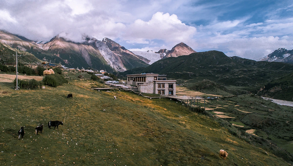 基地隔湖面向来古冰川(世界三大冰川之一),紧邻仅有20余户农家的来古原始村落,设计建造一个拥有20间房间的精品山居,一定也是隐在古村庄肌理中的。我们利用山体峭壁的陡势,将建筑置于其中,一侧是遥对来古冰川的四层玻璃幕墙的景观面,而另一侧则只露出一层脑袋,与村庄融为一体。