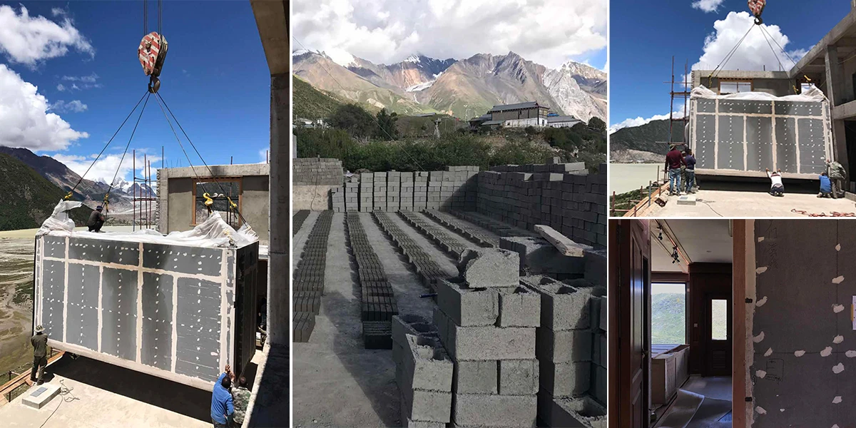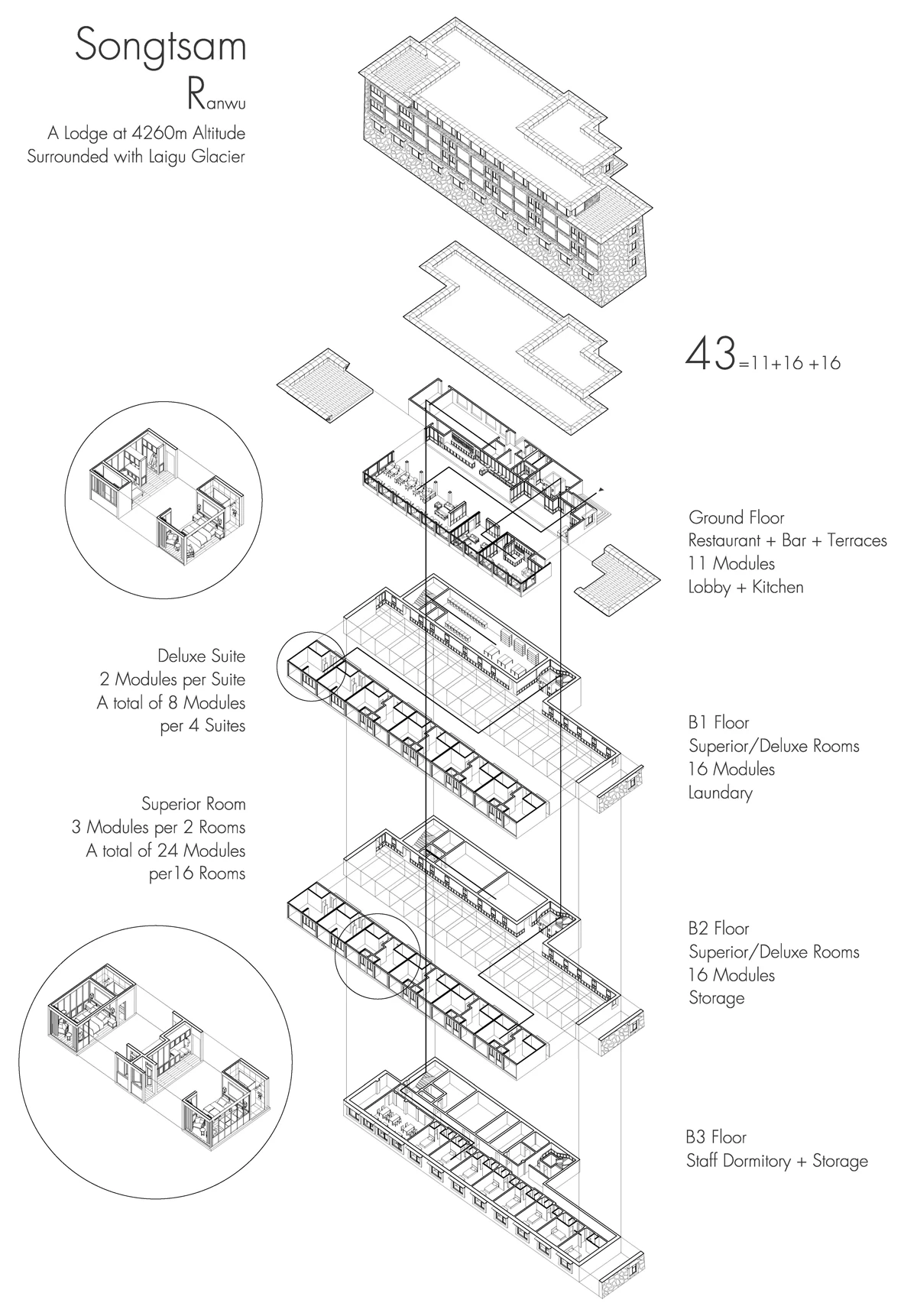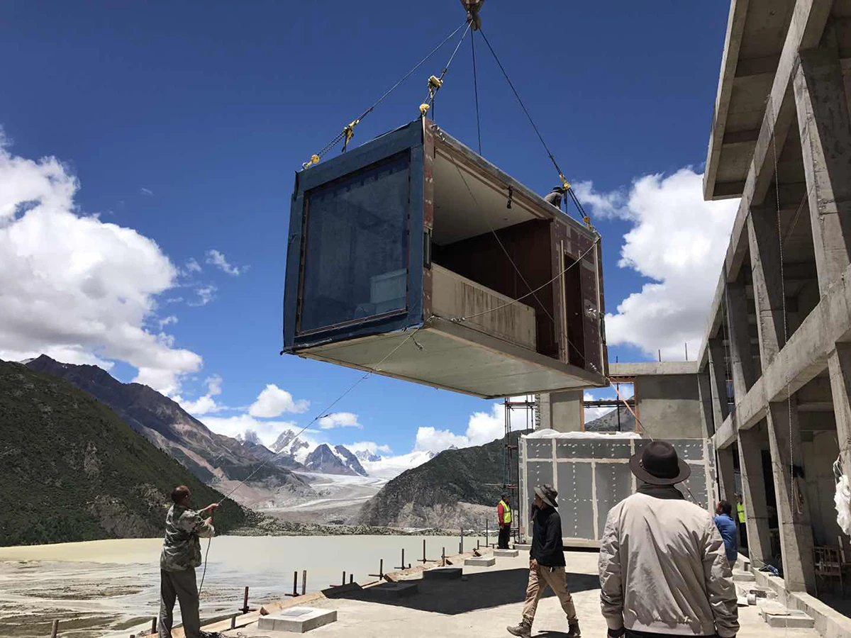 在设计的最开始就考虑建筑的建造问题,是采用模块构建然乌酒店的根本原因。在来古冰川的高海拔环境和如此极限的地域中,土建部分的施工可由四川藏区的工人作业,而来自江浙地带的室内装修工人们则根本无法适应。
