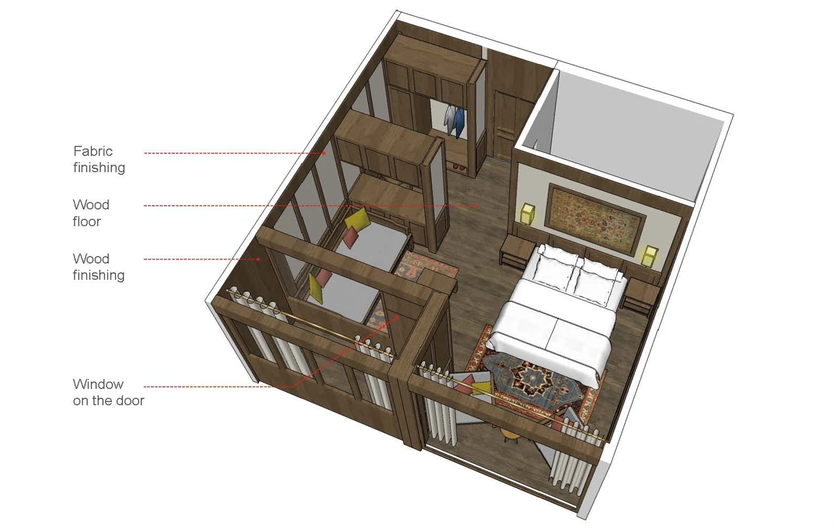 模块本质区别于集装箱,它的意义在于采用预制装配技术解决现实施工困难而不牺牲居住体验,所以模块是一个定制化的设计品,不同于集装箱是由废物利用这一概念所引发的被动使用。采用模块并非对建筑科技的呼吁或诉求,反而是对现实困难最脚踏实地的回答。因此我们与德国模块设计公司X-CUBE紧密合作,对然乌酒店设计中所有模块设计部分做精确细微的把控,最终设计完成的模块其本身有完整的结构系统,并且可以像一个个抽屉那样置入然乌的土建框架中,实现建造的可能性。
