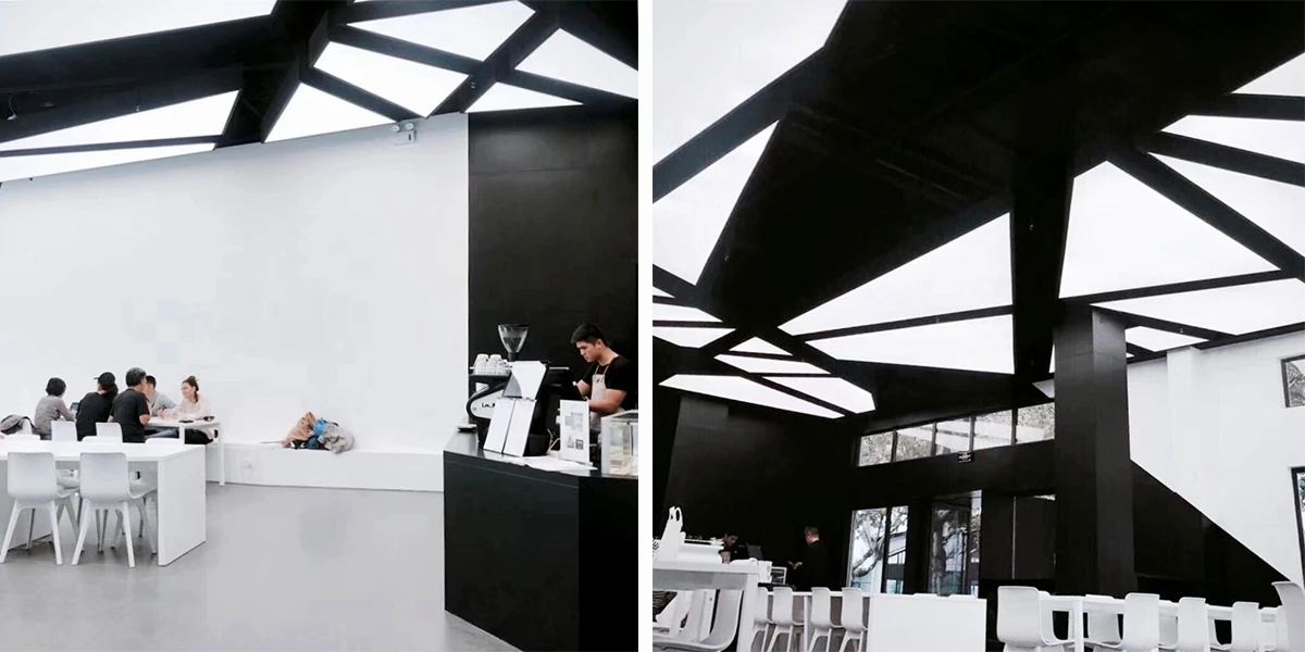 厅借用不同角度的空间错位,利用高低差异进行区域划分,提高顾客就餐的私密性。