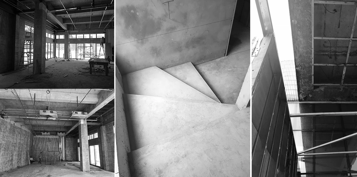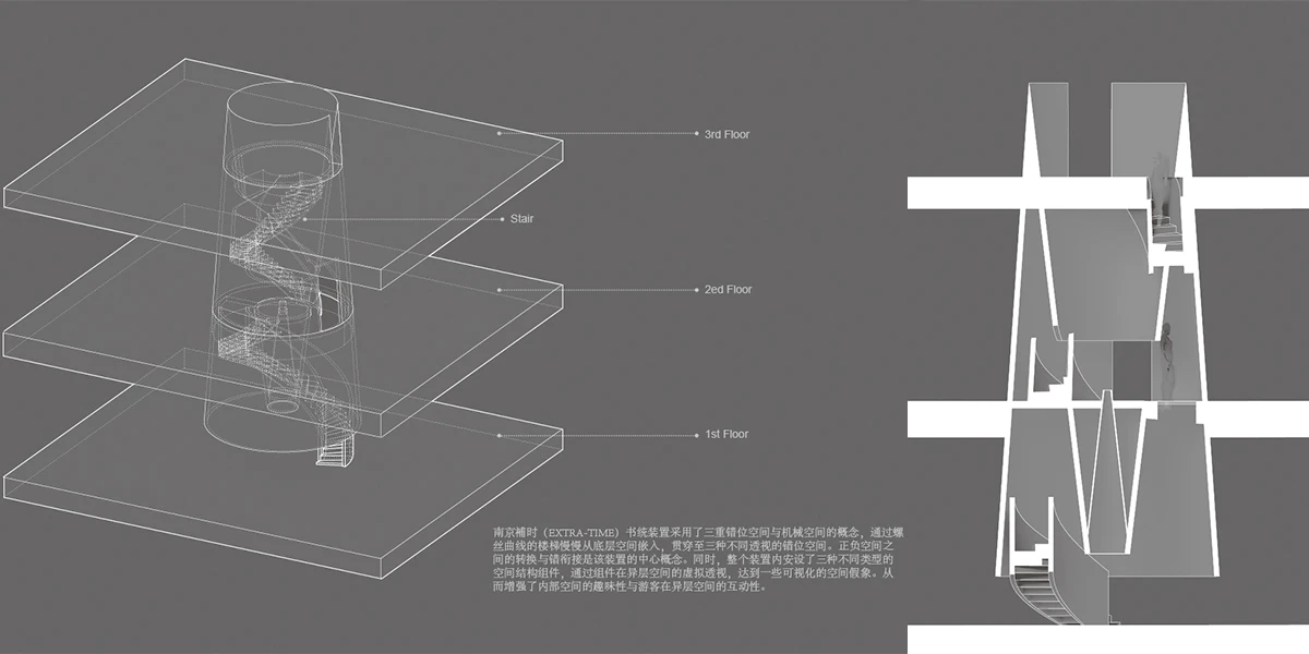 书筒抬高地面1.5m,无法直接看到内部,参观者需要弯下腰进入书筒,添加了对于筒内未知的神秘感。书筒垂直贯穿補時,筒内非黑即白,神圣且孤寂,顶部切口朝向太阳,如同罗马万神殿象征着神与人的联系。将书筒一分为二,人通过白色双向楼梯步行而上,对面是具有对立感的黑色书架,使体验者在路径中生强烈的孤独感。