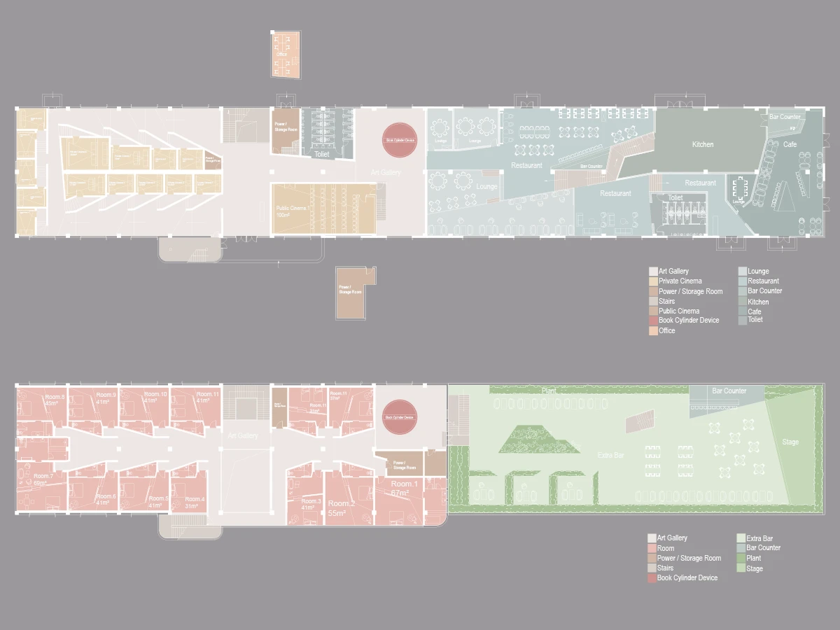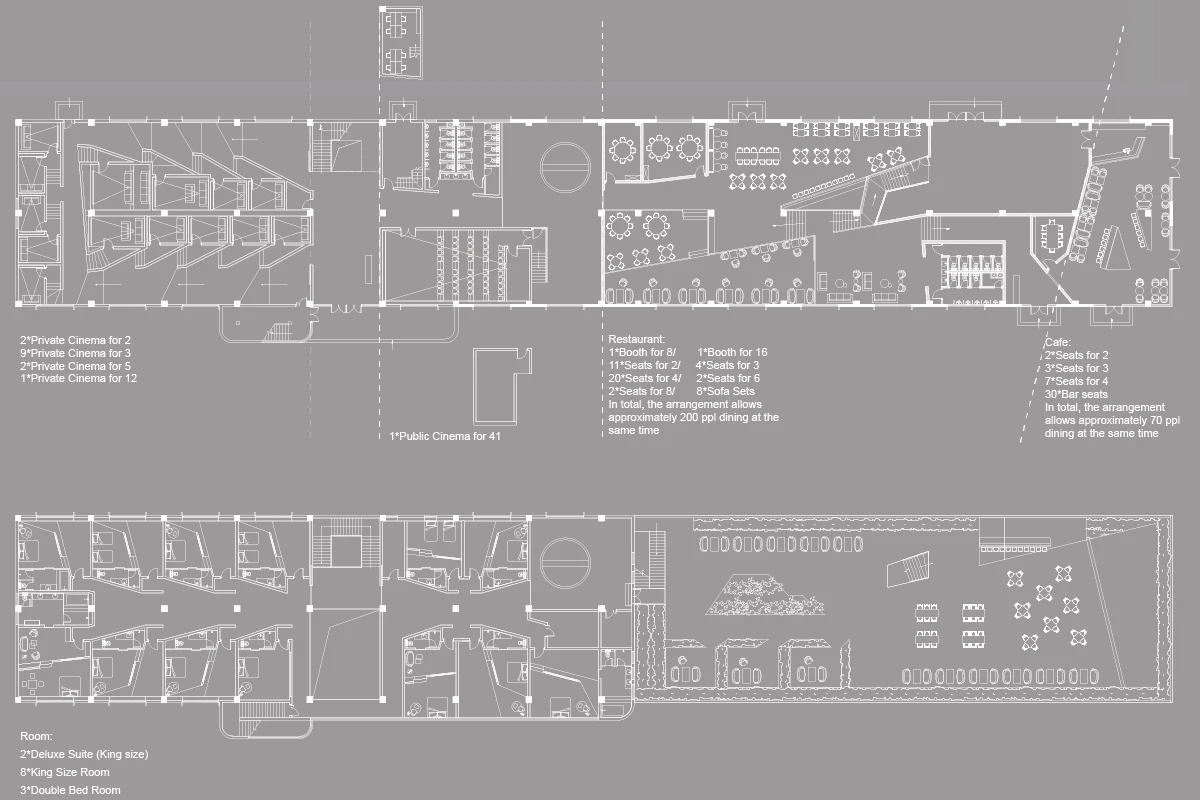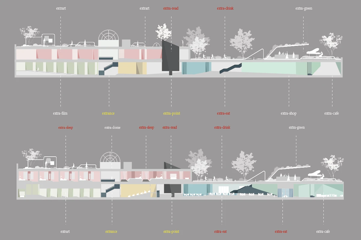 例如露天酒吧,它也可能成为举办社会活动的场所,途径客房的过程中欣赏艺术作品,出影厅又瞬间进入艺术的氛围。拱顶区为主入口,不但为展厅提供服务也是酒店的check-in和影厅的检票区。