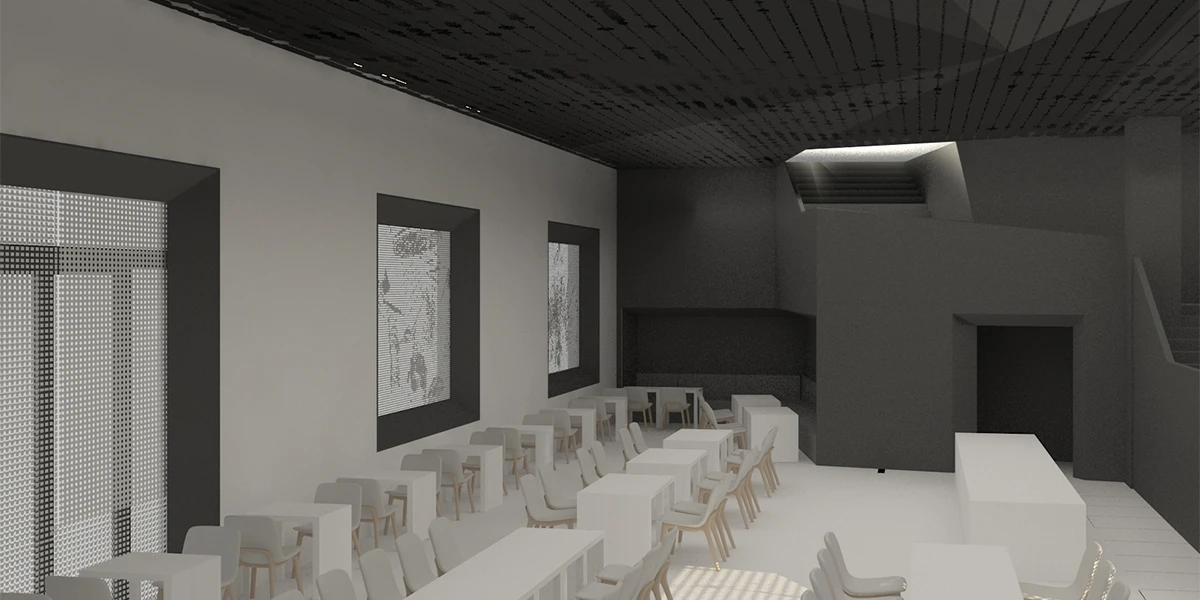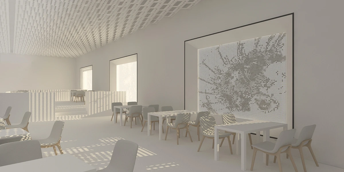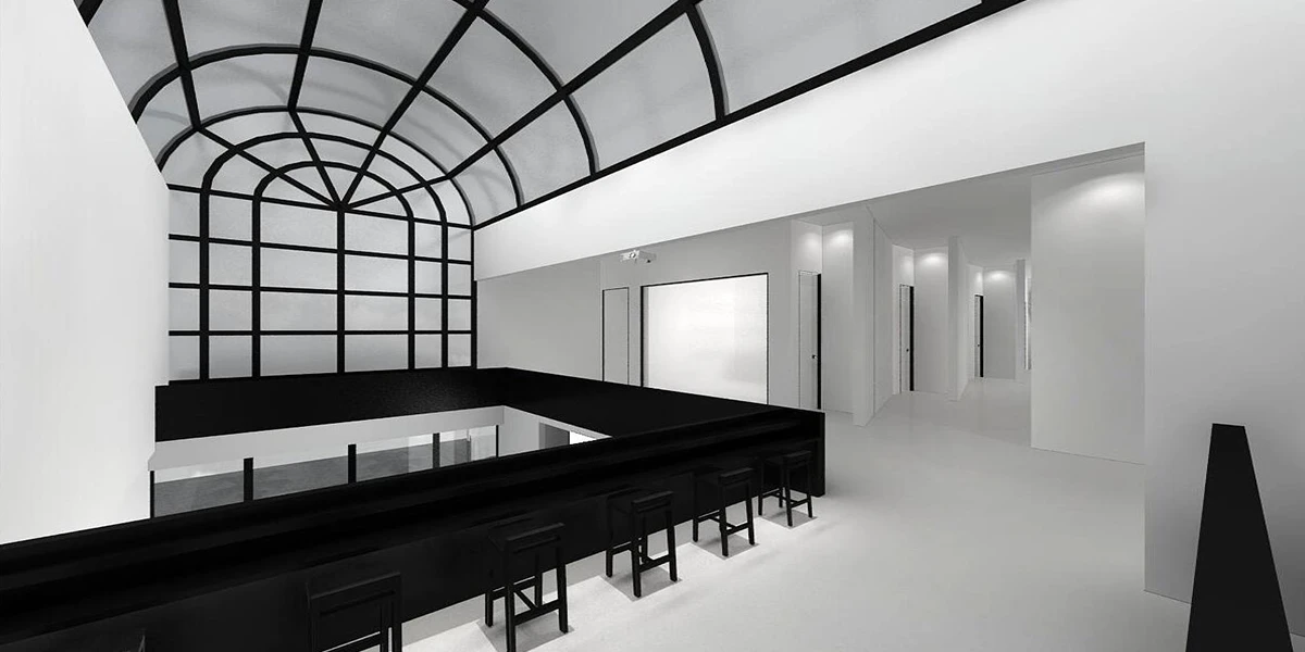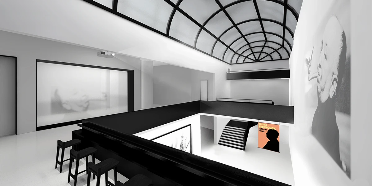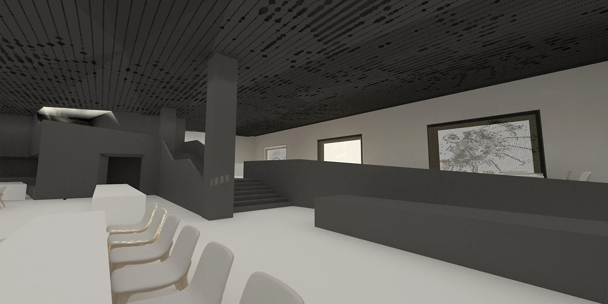 例如露天酒吧,它也可能成为举办社会活动的场所,途径客房的过程中欣赏艺术作品,出影厅又瞬间进入艺术的氛围。拱顶区为主入口,不但为展厅提供服务也是酒店的check-in和影厅的检票区。