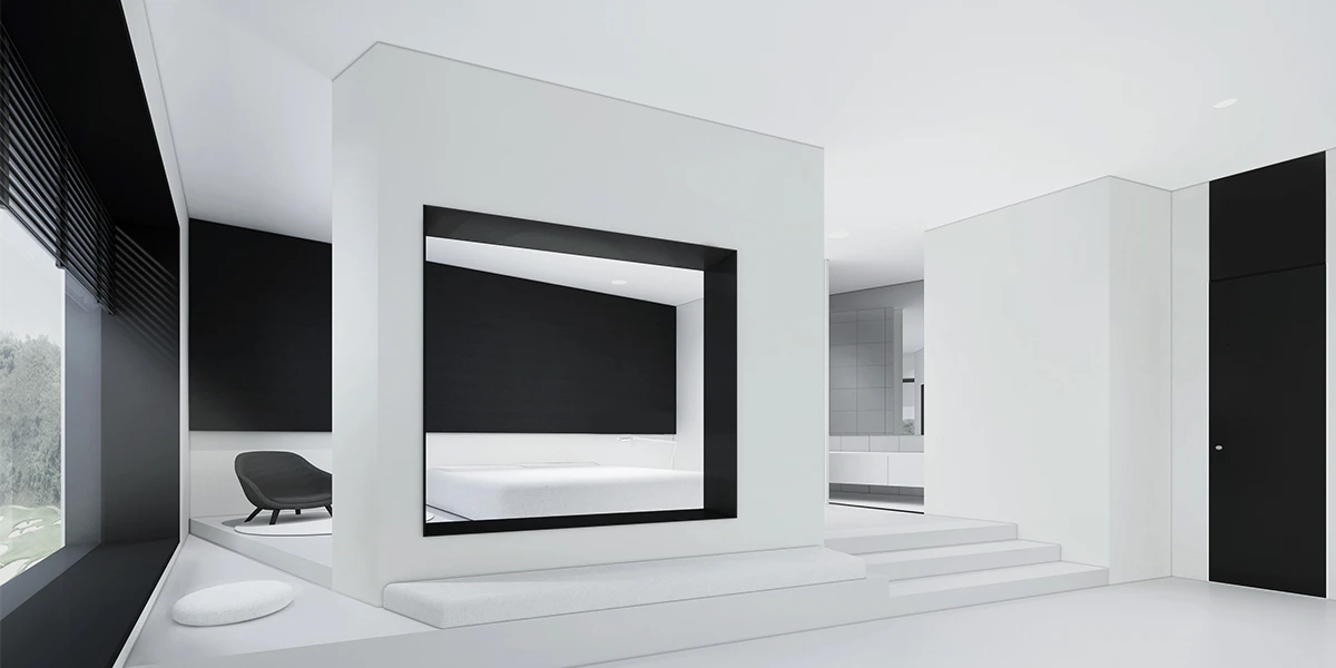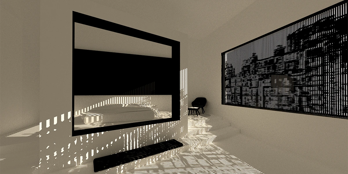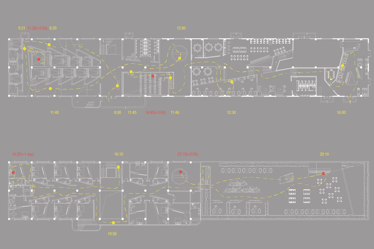 VIP套房则是另一种窥视空间,单向镜作为一道围墙,视线只能由内而外的单向进行,躺在床上就可以看到走道上的参观者,在满足好奇的同时也会担心被他们看到,这是一个刺激的体验。VIP套房的住客还可以控制公区屏幕的播放内容进行现代信息化的资源共享,“看于被看”影响着我们的身份,我们即是参观者,也是行为艺术的作品。