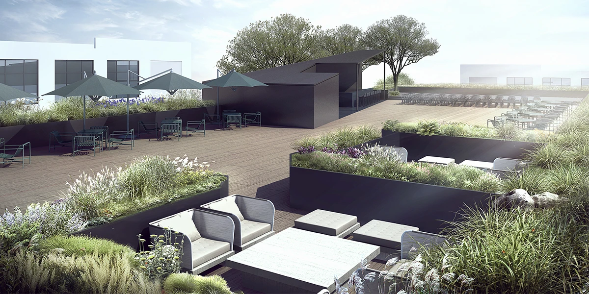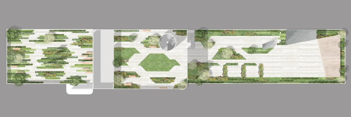 以楼梯口为分界线,右边靠近客房,定位更偏向花园,较多的绿植保证隔音,包间也由绿植围绕而成,楼梯以右是从地面延生而起的露台酒吧,吧台是楼梯的延伸,舞台的位置是吧台的正切,整体造型干净利索,酒吧在风雨天不开放,吧台可以封闭,座椅能收起。