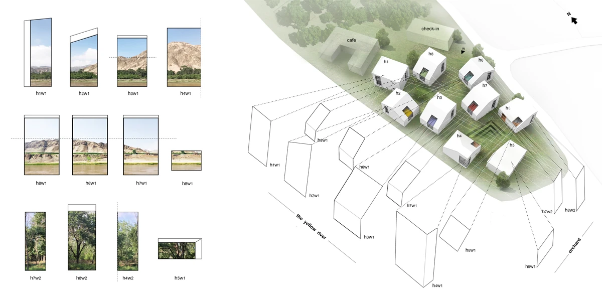 在严格的景观轴线分析后,罗列建筑所有的开口和窗对应的景观面延伸线,将建筑单体调整到最佳位置,使错落有致的建筑缝隙中均可享受到黄河、果林、院子和阳光。