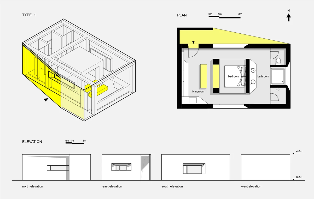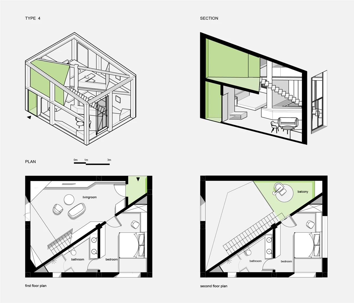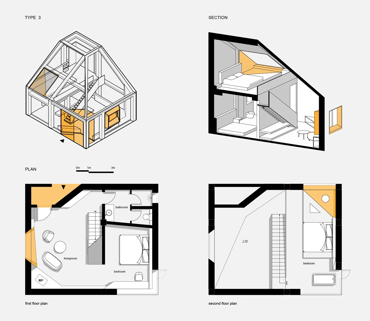 同时,根据建筑体量,尺度较大的双层单体被置入场地视线的盲点,中型体量和斜坡屋顶建筑则在场地边缘,唯一的单层建筑体落在景观轴线的末尾,建筑肌理组织和空间秩序被重新调整。