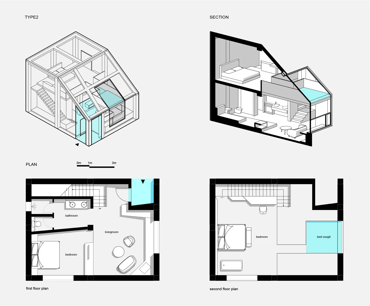 室内中缩小的方块将平面纵向划分为三个功能块,立面上四层窗景的叠加产生室内外具有穿透性的空间对话。视线的穿越跨过的不仅是实体的空间,也是对框景外看不见的场景激发更有欲望的探索。