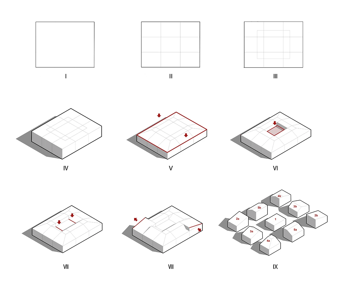 将一个长方体切分产生九个建筑单体。通过线与面的推、拉、压等手段,形成五组建筑形体。相互关联,其差异性又满足不同景观和功能需求。