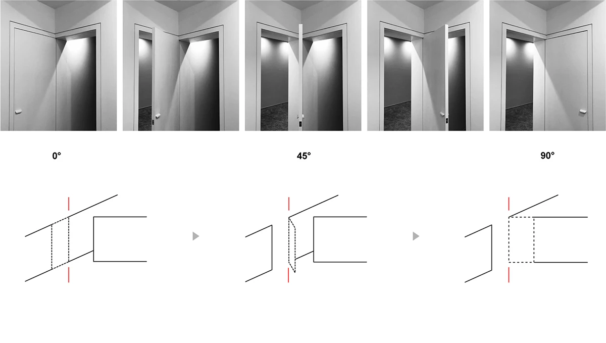 我们开始思考关于这道「界限」的归属。两个门洞、三间房可否共用一扇门? 这是概念上的突破,但需要各种技术性的尝试。制作时,普通门的厚度阻碍了空间活动双面性的特殊需求。我们用一道中心轴,贯穿「门脊」使之自由;当任意面闭合时,能够完全齐平,融于墙体。