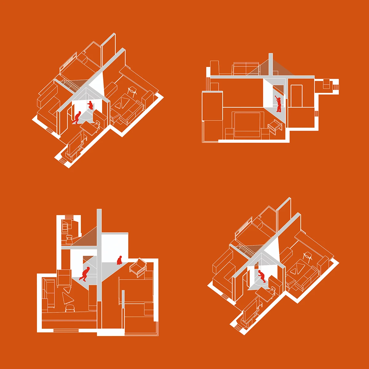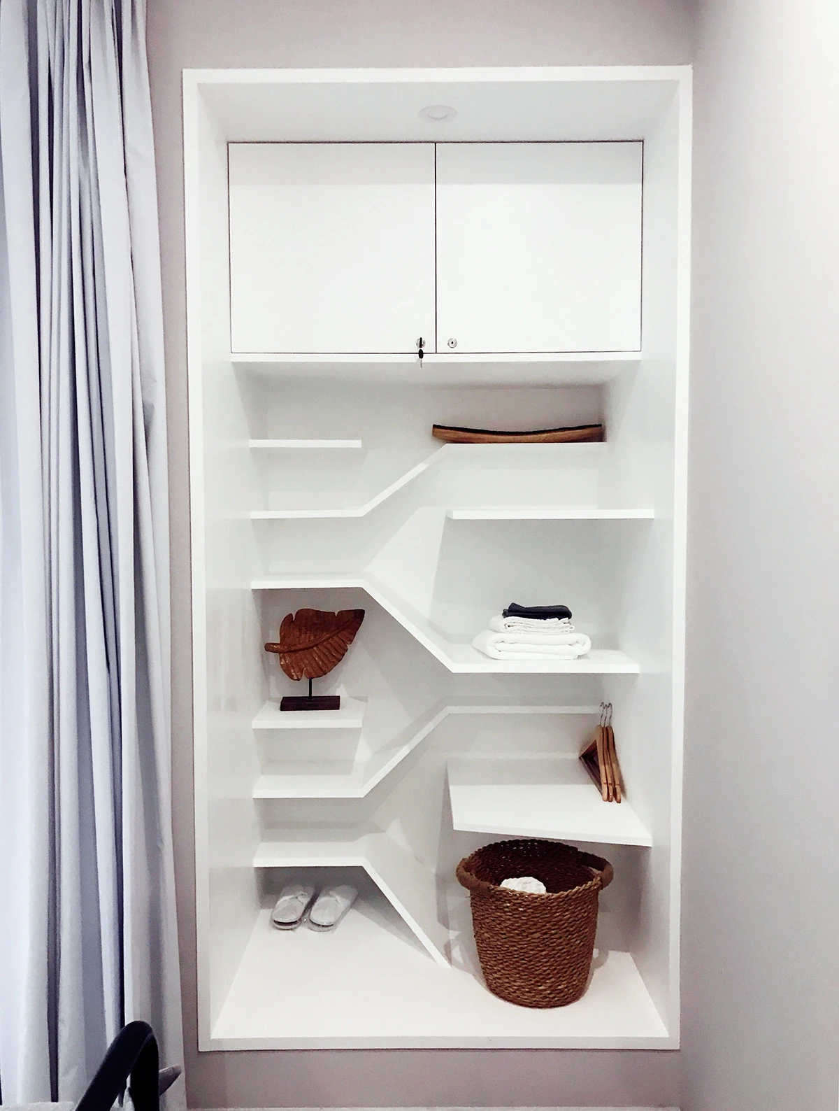 相对于自由「门」,壁橱这里有一道隐形的「门」。它打破了固有封闭的储物形式:多层起伏的敞开隔段,或抽象、或熟悉,源自「儿时躲藏」的追溯,再现孩提视角下的童真场景。