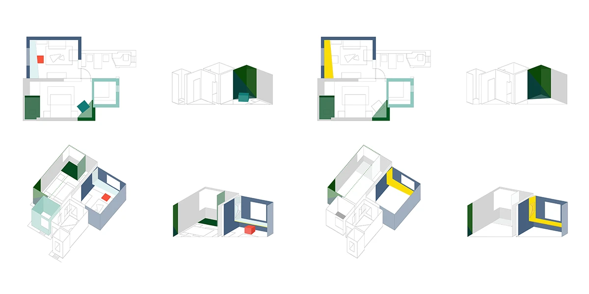 明快的色彩,永远让人愉悦。颜色本身可以作为一种界限,又可以围合不同的空间状态。由于原建筑的局限性,试图避免实体空间的再划分,而颜色可以模糊二维与三维的界线关系,再次定义多重空间。空间通过颜色,相互穿插、借用,既而引伸,局限的空间被视觉拓宽。