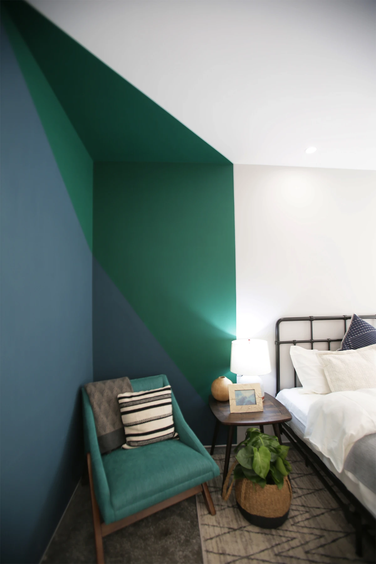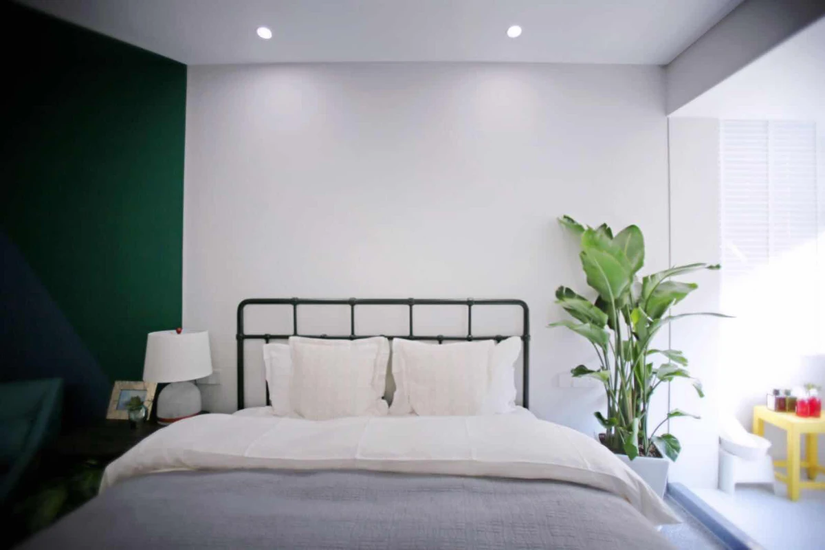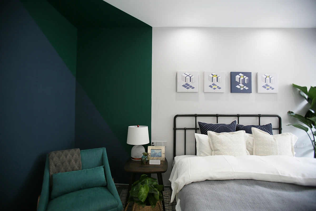 这是一种空间序列性,颜色的明暗引导人的行为与发生的事件。卧室越向内颜色趋向饱满,蓝绿色的角落,是在伞状的树荫下阅读;靠近室外,越明亮,是在斜射的阳光中沐浴。