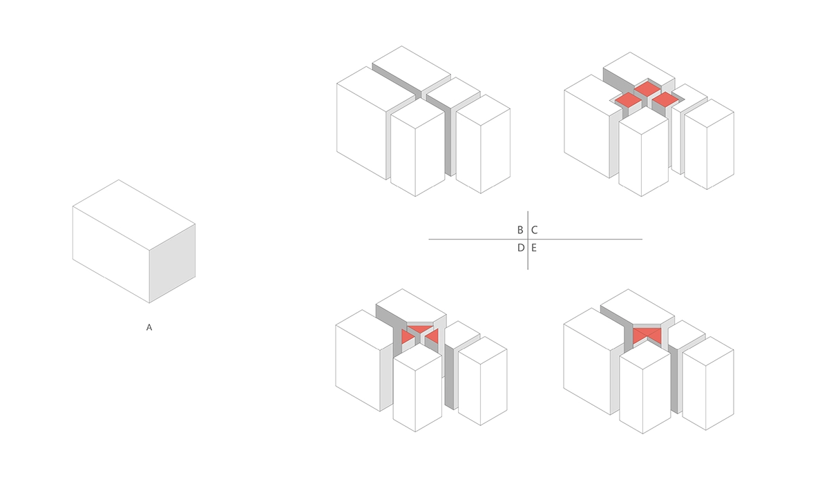 而三间房相连的白色区域,都被几何划分和再次聚合,形成了一处新的饱满空间,这就是+ONE的空间概念:三个主体空间之外的 “+1空间”。