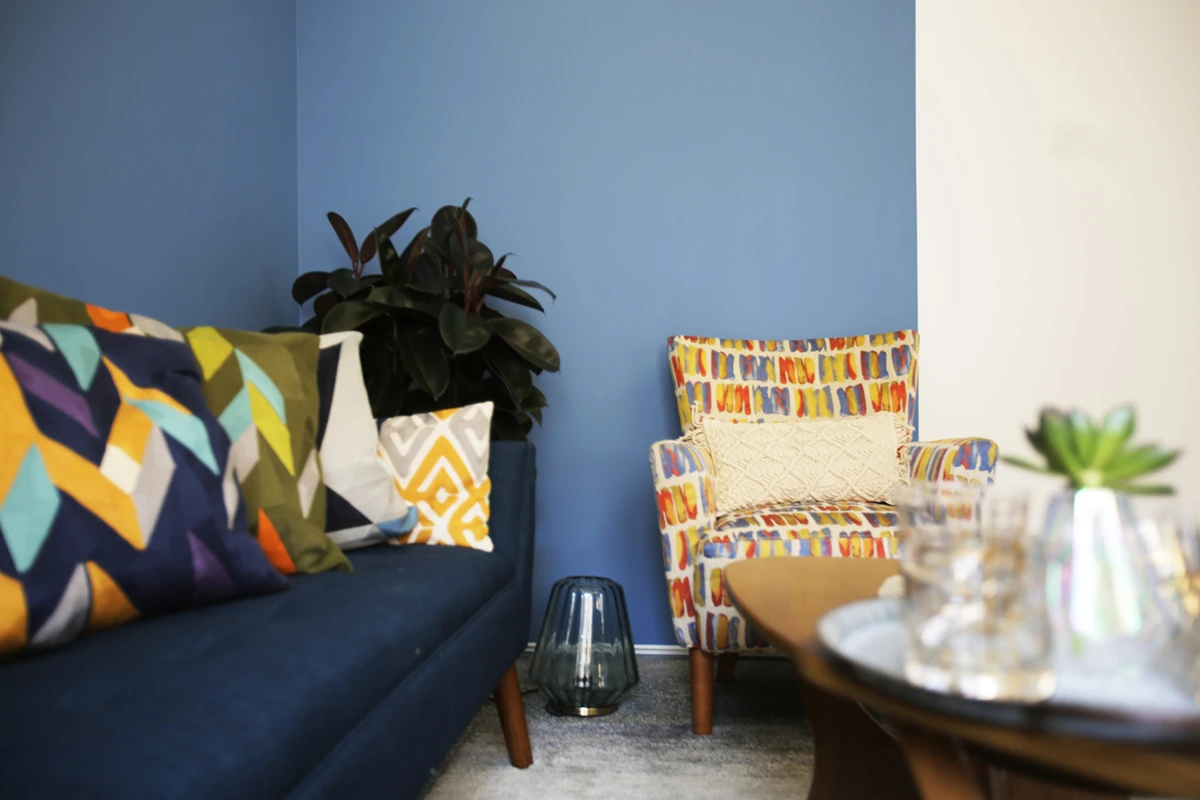 起居室被色彩界定出富有精神活力的学习区域和闲适的休憩空间。后者夜晚使用较多,选择了蓝灰色,让人放松、沉静。前者面向窗台,一整条明黄色书桌,高涨的情绪、欢快的心境。