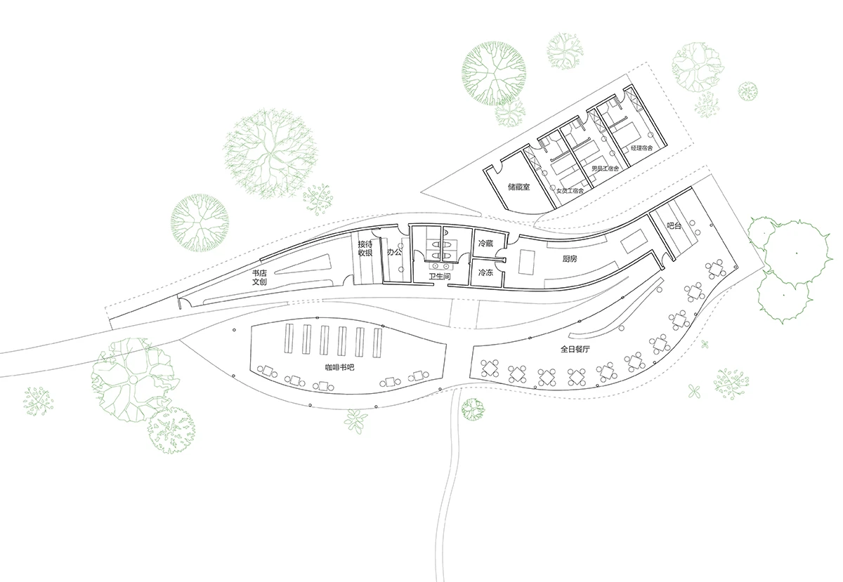干栏式建筑多以防潮而建,长脊短檐式的屋顶以及高出地面的底架,都是为适应区域多雨需要。此处建筑形式多以山墙顶端三角区域直接开敞的做法,用于采光和通风。陇门古有明火炊事,平时也会将日常所需柴薪堆放于山墙脚下。设计延续当地建筑肌理山墙-枝干-柴薪-青石地面,层层「界面」过渡后,外立面的概念被弱化,建筑和自然环境之间的界限变得模糊而不确定。