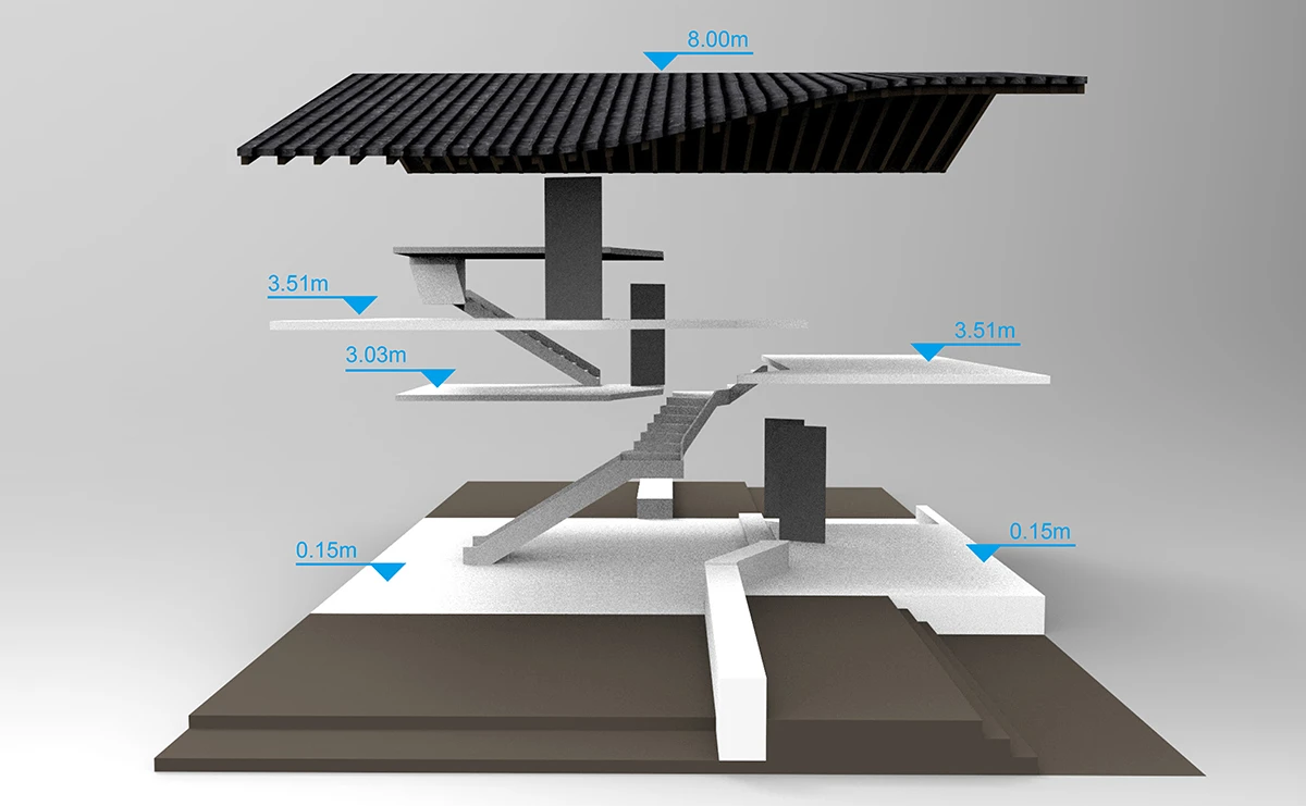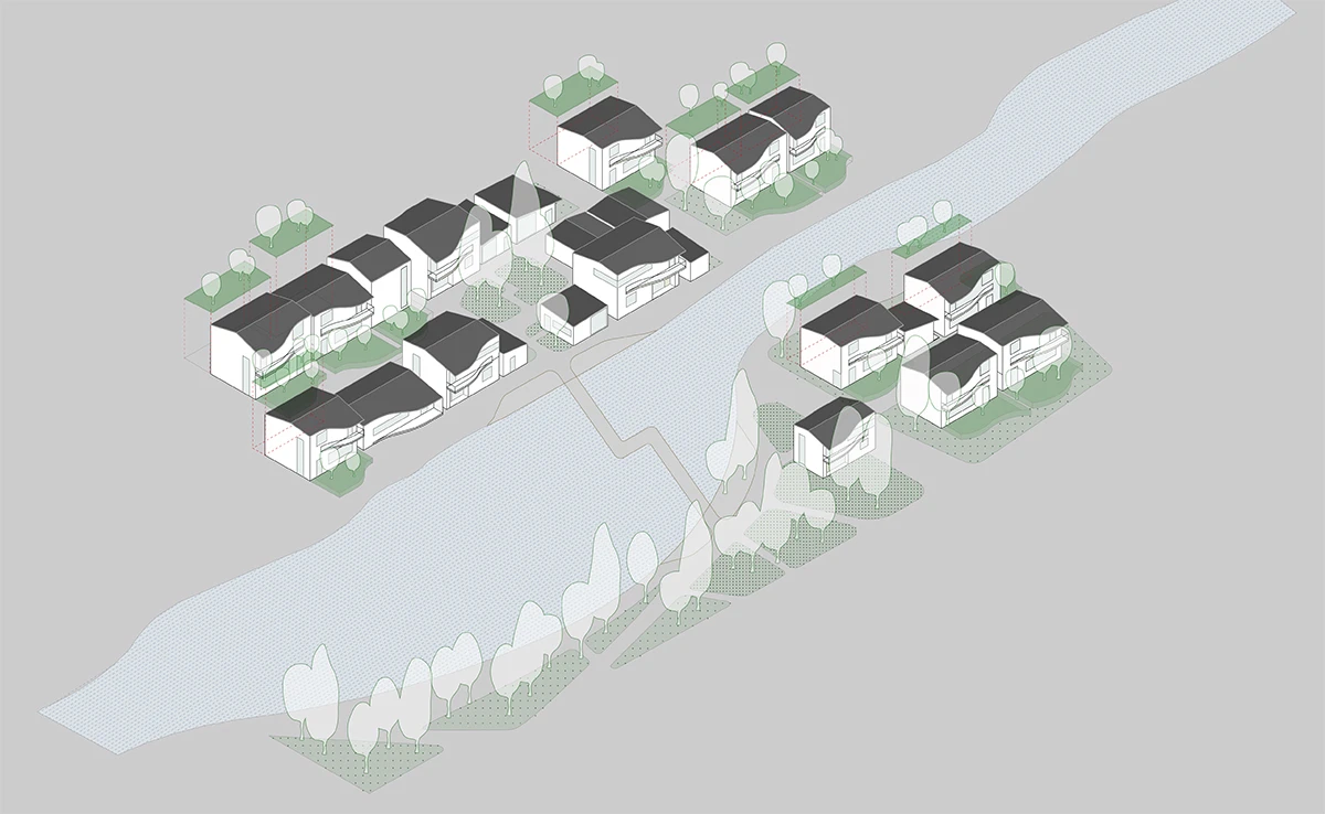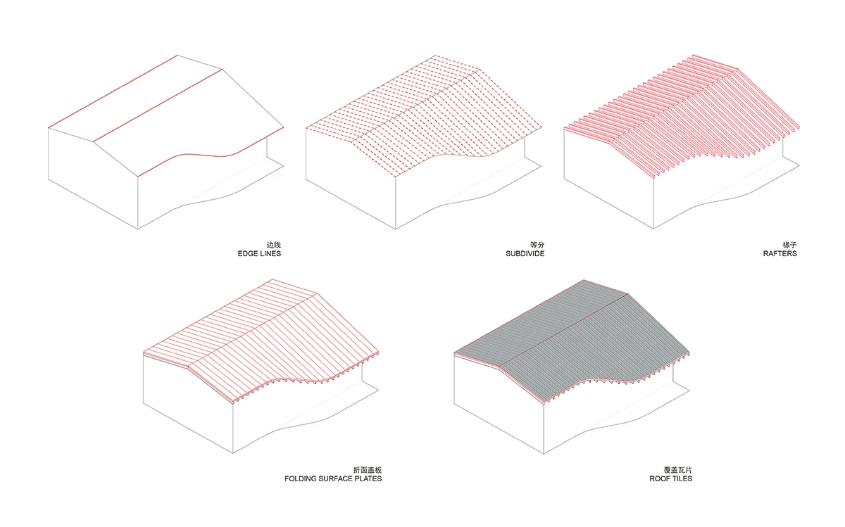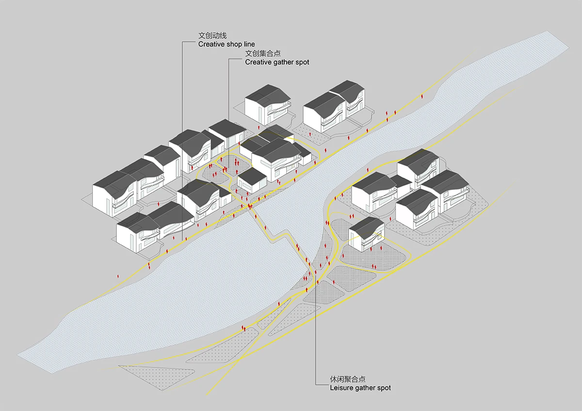 设计以传统村落形式为原型,用现代的手法重新转译为「浦江·宿集」特有的建筑形式。功能序列延续曲面的空间形体自然流动在建筑内部。