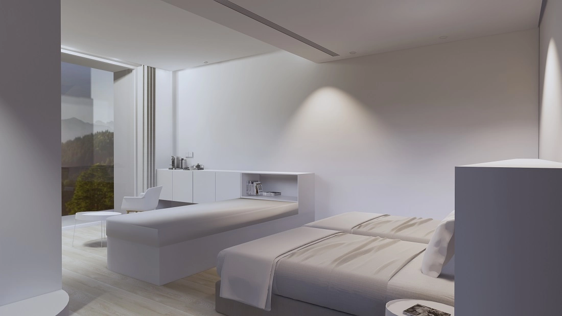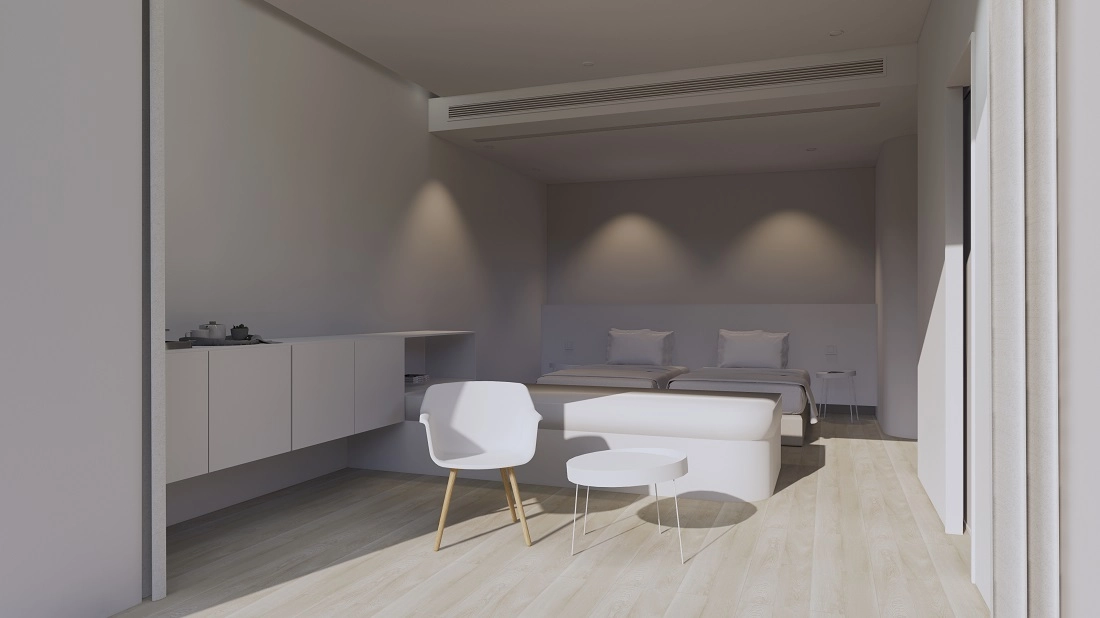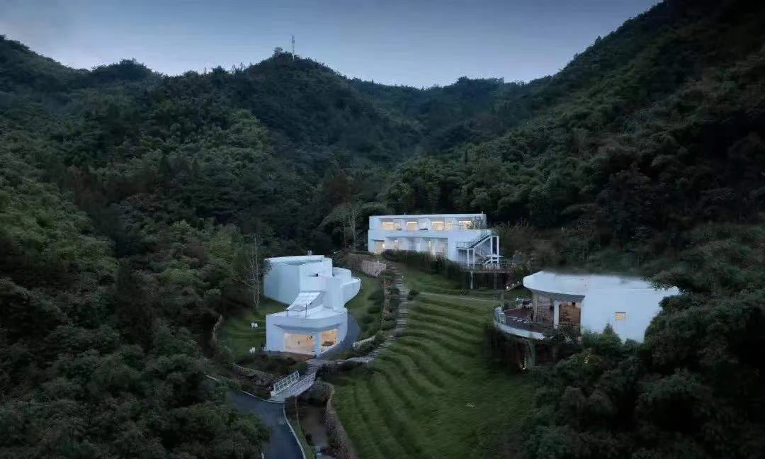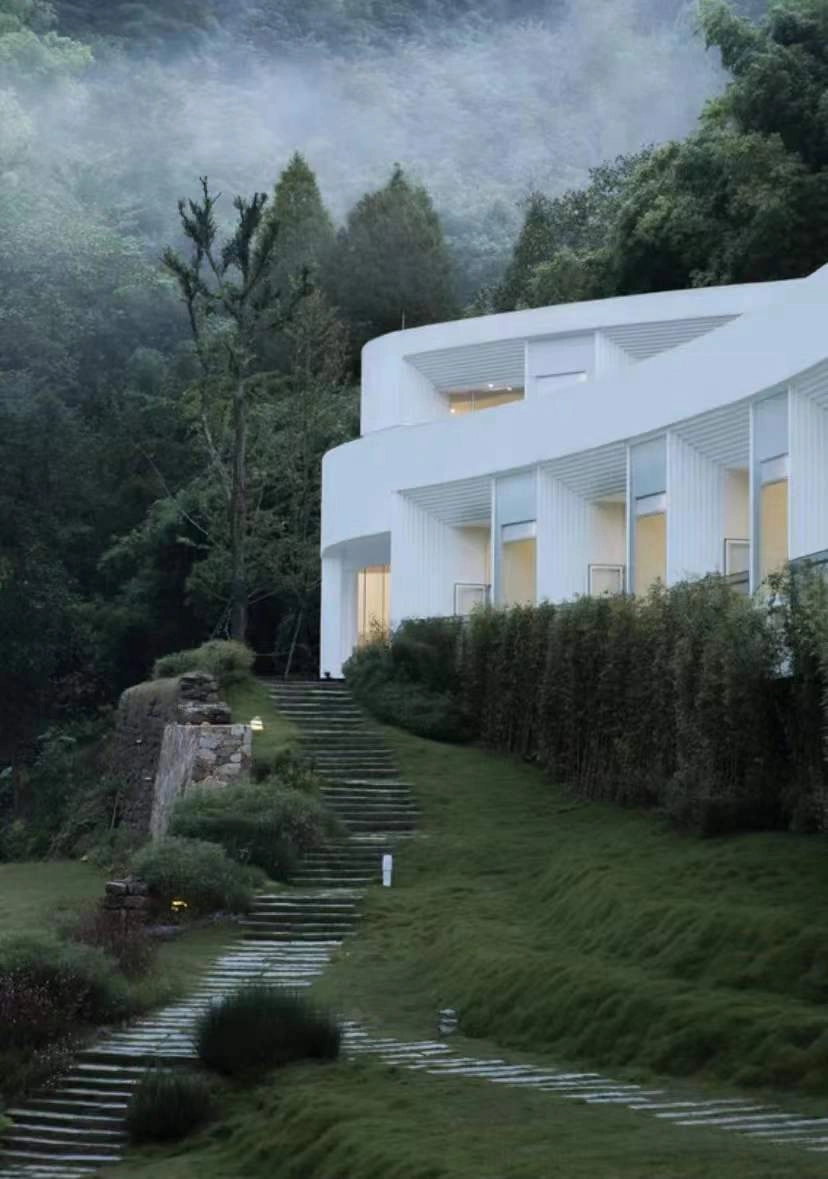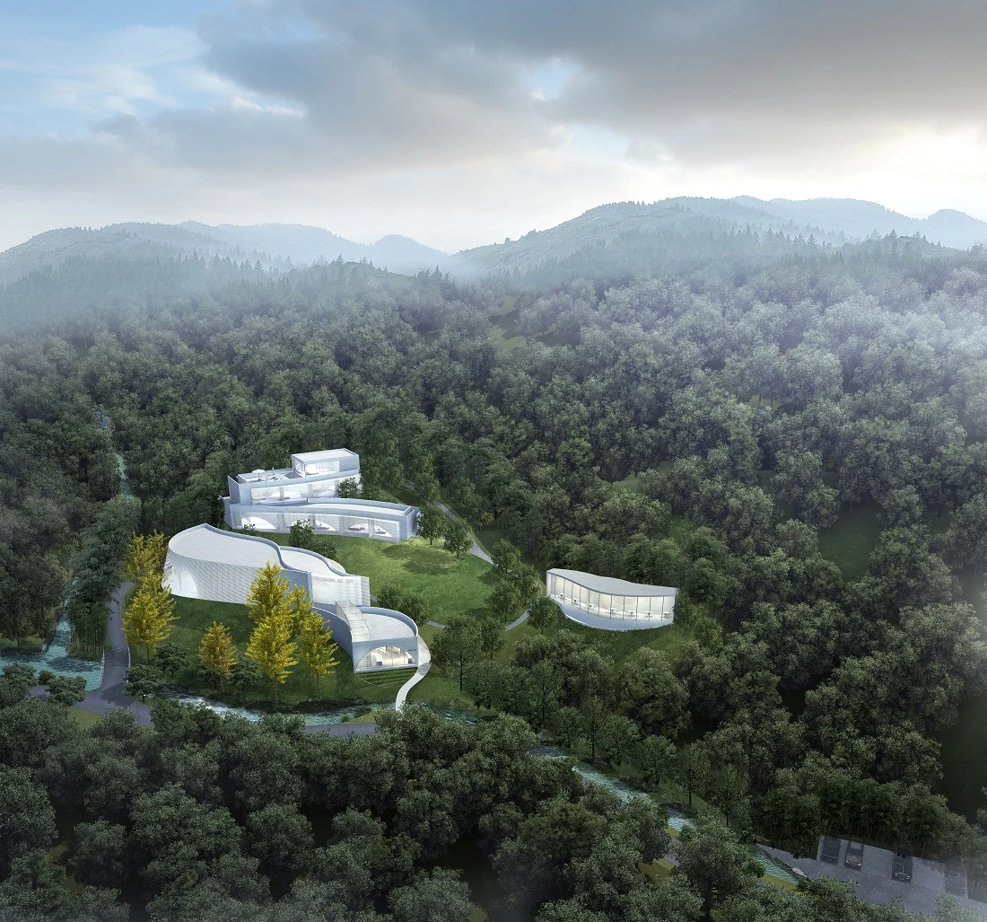 「Plan B · 釉白」以彭州当地的白瓷为线索,形成由小型艺术馆、文创店铺、高端民宿和森林餐厅组合而成的建筑群落。场地坐落于高差十余米的山腰上,台地高差分级跌落,建筑倚山形错动,顺褶皱而生。