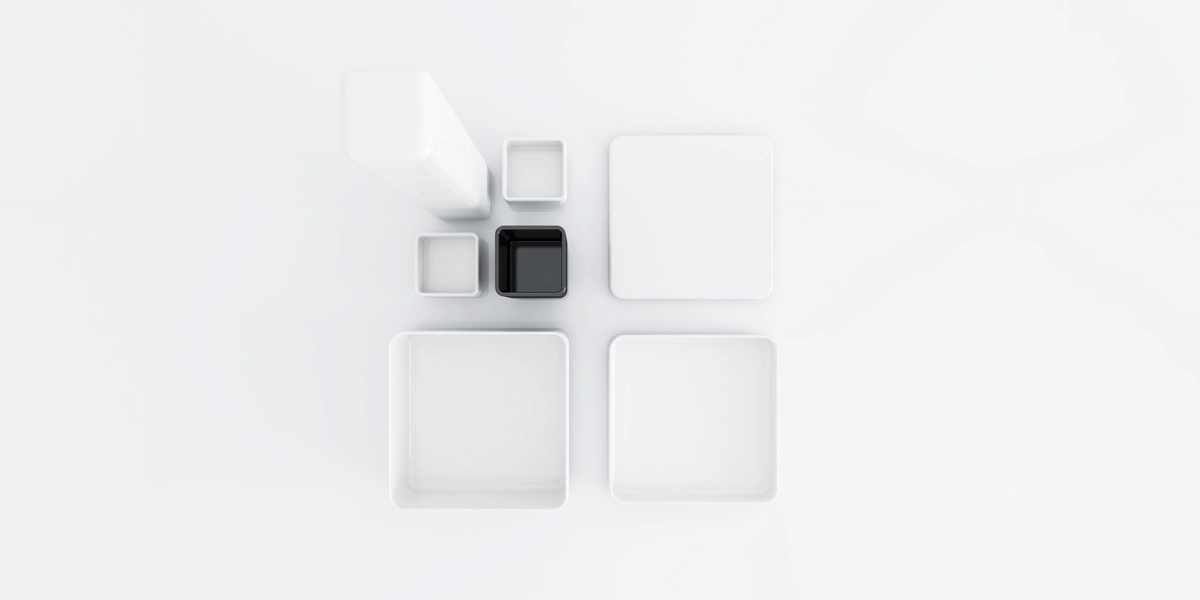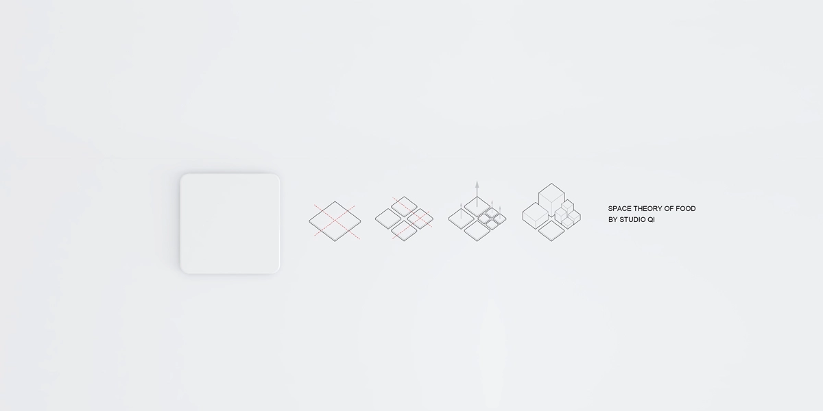 将空间规划理念微观运用,并借此尝试容器的组合尺度,对人的行为、食物,和空间视觉的影响。餐具主体由一系列相同模数的方碟组成,并根据所盛食物分为深、浅、平三种高度;辅助餐具外径取模数的1/2。其中汤圆碗作为唯一的非正交餐具(两个可相互契合成球型的圆碟,并以45°斜切,使两者均具有方向性和个性诉求)在理性规划的BLOCK中占据主体地位。当餐具陈列于桌上,餐桌被无形的正交轴线划分成等量区域,辅助区域则在更小的层级上被二次分割,不同餐品置于事先设计好的“规划区域”内,不仅在尺度把握上体现用心,更有“相配、适量”的膳食理念隐含其中。几何原理同美食逻辑完美暗合。