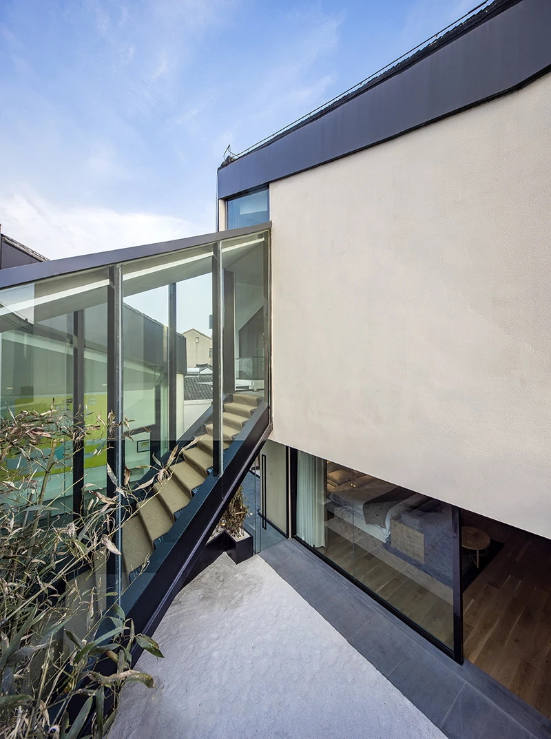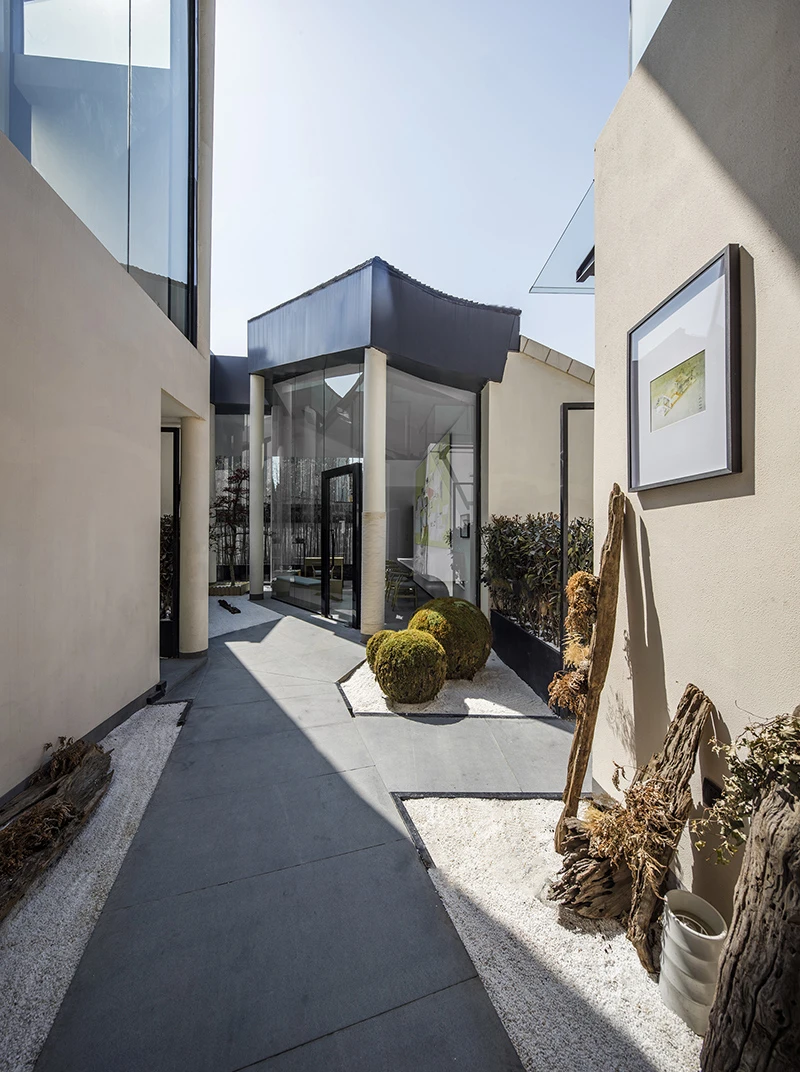 饮居·九舍的设计注入的是对城市设计的思考和对生活的理解,选址西塘古镇,是寻求可以回归旧时邻里间最为亲切的空间尺度和人与人之间带来的安全感。西塘巷弄纵横、水岸交错,民居坐落于河道两岸,不同家户倚肩而建,交互跨越,后来居民又在其间填缝搭设,窄而形成室,宽而形成院,临水而成廊,聚集而成巷,这便是古镇独有而丰富的非线性负空间集合。九舍则是它的延续与创新。就像吴冠中笔下,保留着最为动人的小桥、流水、人家三维立体江南图景。
