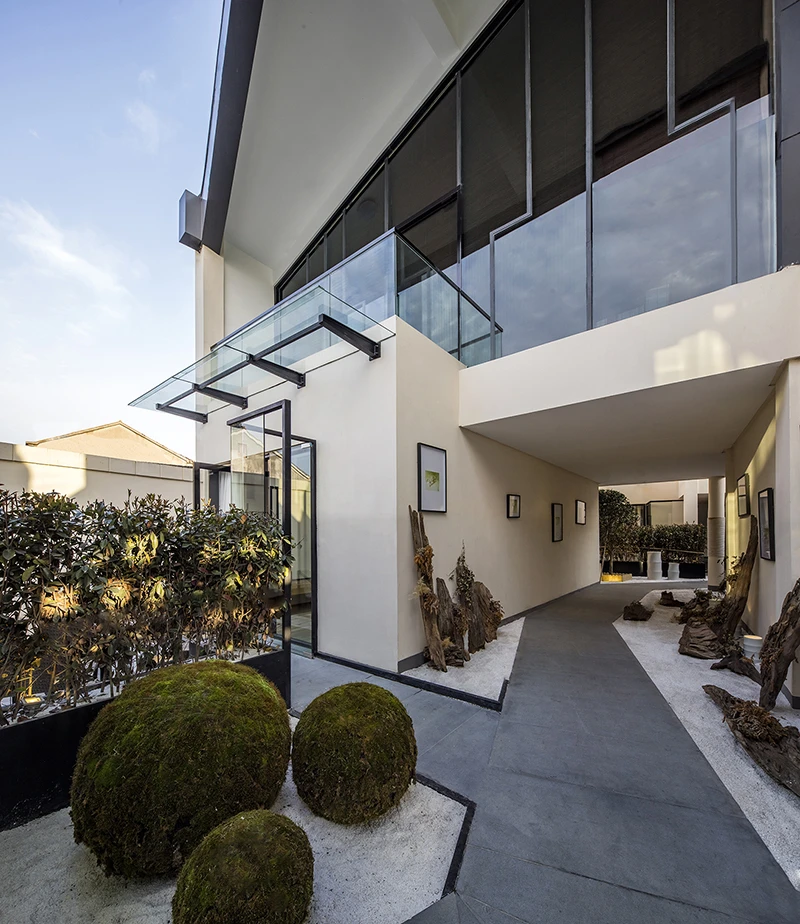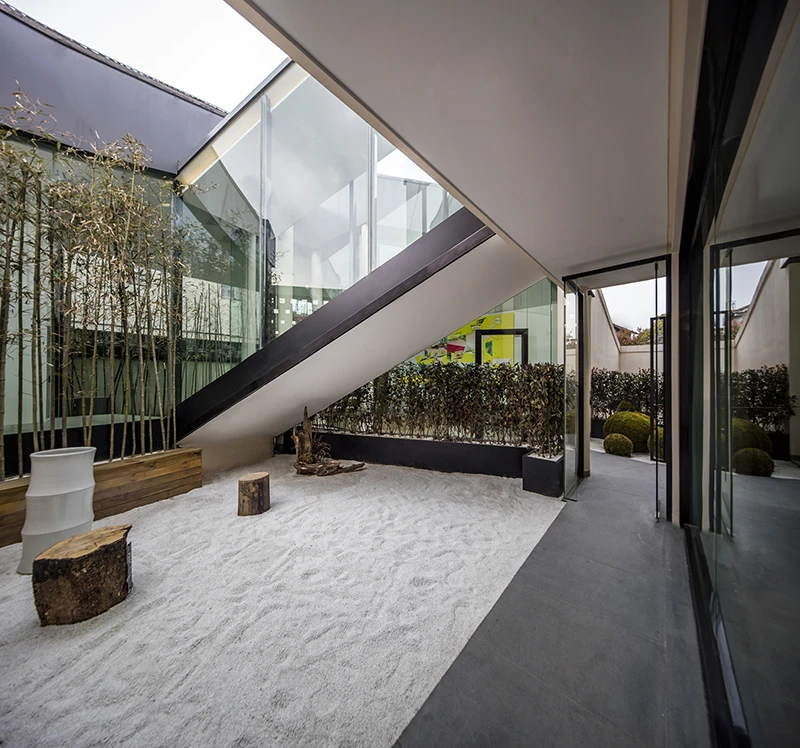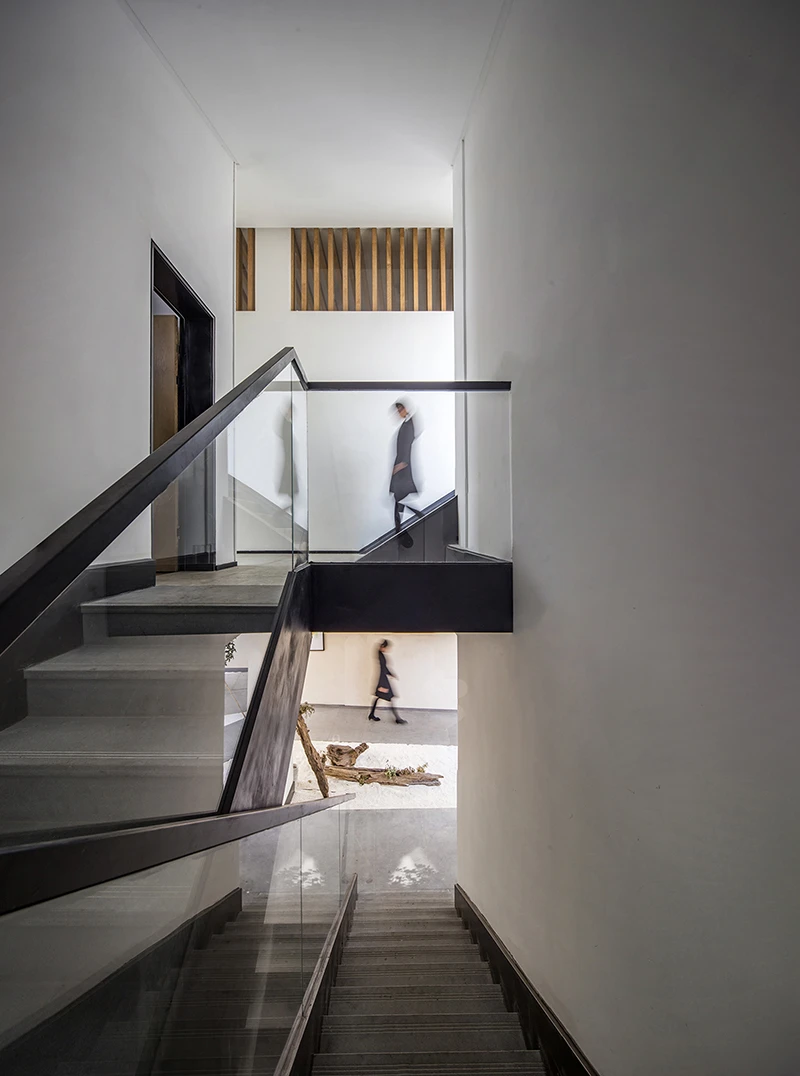设计又植入了多重渗透的空间动态关联。创造了和柯林·罗的《透明性》(Colin Rowe’s Transparency) 一书中空间现象、事件、视觉、行为层面的共鸣,以及对于建筑的穿透力的思考。九舍的渗透性不仅是简单的玻璃透明,而是其正负空间的互动。人在此空间里,路径产生潜在的指引性,视觉有无形的穿透力,在不知不觉中,被空间影响,并参与了空间时间的形成。九舍就应该是这样一个面向社会的发生器。
