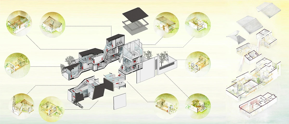 九舍不是一个建筑,而是一个建筑群落,是古镇有机堆叠的建筑形体的微缩,提取数个房间模数的体块,将其基地边界动态摆放,体块间均匀留缝,其间以上下,左右错的方式来表现空间节奏感,形成荫处、阳台、以及巷和廊;同时用镶嵌在庭院中的“桥”链接不同的建筑,越级而上,成为交通分流的枢纽。桥洞架起的一层院落与休、居区结合紧密,形成桥(小桥)、庭院(流水)、建筑(人家)别有的立体空间关系,使得公共空间和私密空间置换,楼下为住宅空间,楼上为公共空间。使住客在早晚使用频繁期都能充分亲近自然,而在日间使用教频繁的品、饮区,院落和自家的瓦檐则成了登高望景的的对象。