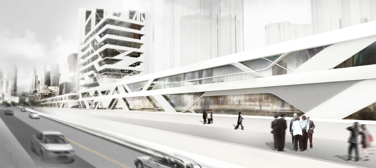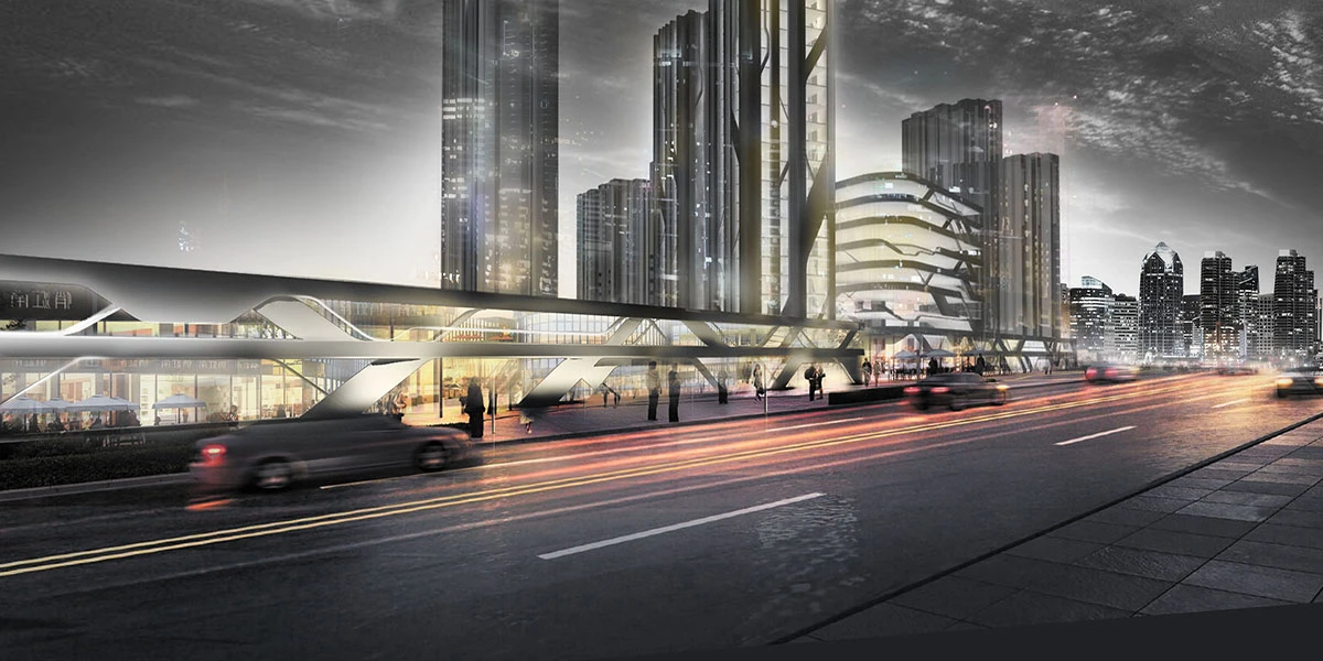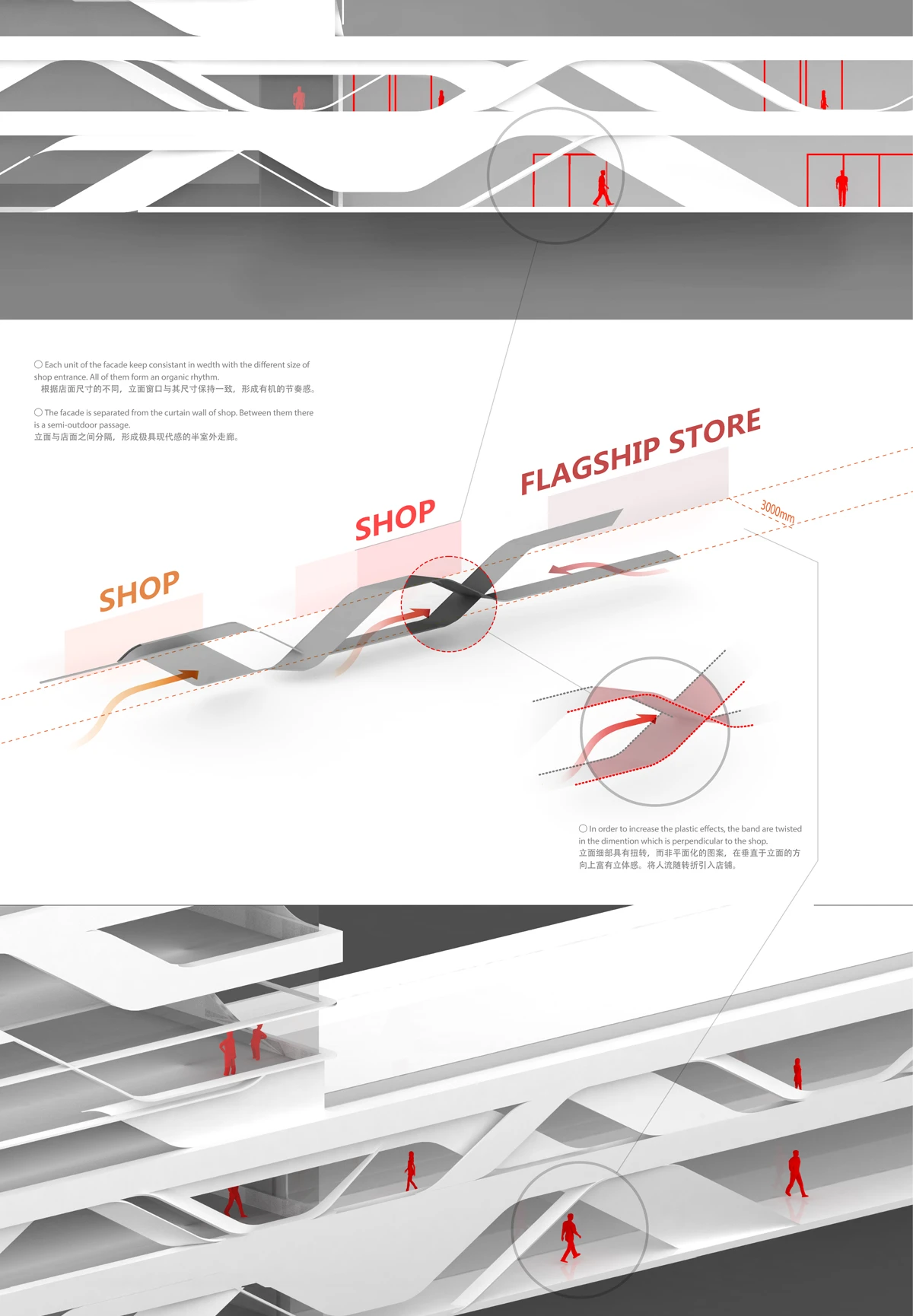 本项目位于杭州市中心地带高架桥旁, 其对面为赫佐•德梅隆设计的城市中心区。作为中档商业店铺的外街面,则着眼于和对面的经济中心形成过渡。设计时为了很好的解决建筑立面与横跨的高架桥附近的街道关系,利用行车交通时对速度和沿路风景的体验和人为行走时对周边建筑的视觉观感,提炼出“流畅曲线”作为概念,空间和时间在相互转换的过程中创造了动态时序。车流与流线型的立面形成了极强的动态呼应,视觉上不仅被控件限定,也随时间按动态事件展开。建筑师巧妙地将外立面扭转,不同于平面化的图案,在垂直于立面的方向上富有立体感,将人流随转折引入店铺,立面与店面之间的分隔形成居现代感的室外走,是商铺店面的间隔系统。