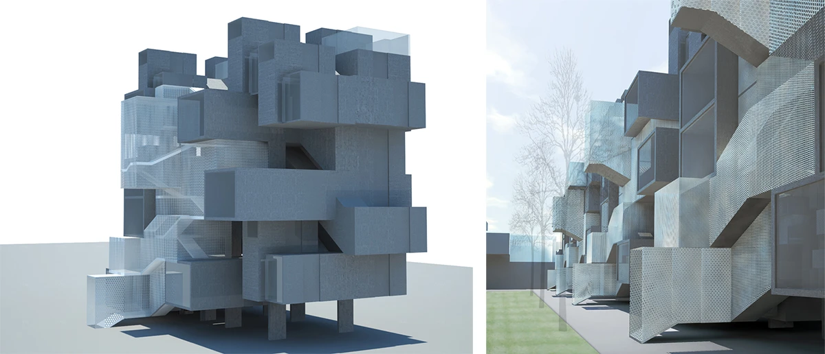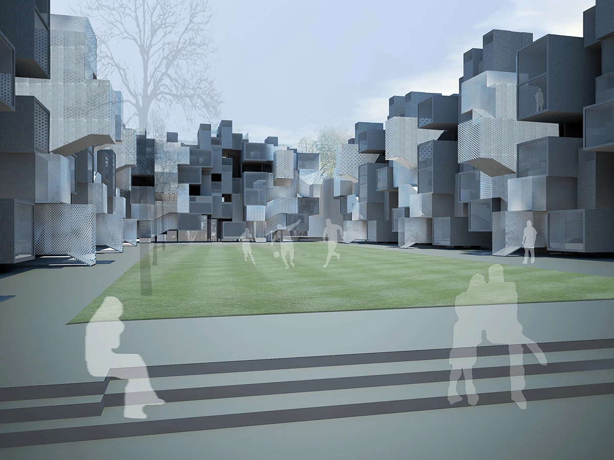 多个Suite由流线不同的垂直交通串连成一个Cluster,不同形式的Suite又组合成3种不同类型的Cluster,尽管每个最基本的L形Unit都是相同的预制体,但仅仅依靠排列组合的一点点改变,就可以使学生公寓的空间形式产生多种可能性,如同由许多不同大大小小的聚落堆叠而成的竖向生长的城市。不同的流线转折营造出丰富的公共活动空间,为每个Cluster的日常活动提供更多的可能性。垂直结构体也保证了每个Cluster的交通流线在个体差异基础上的清晰直接。虽然错落的Cluster聚集到一起乍一看让人觉得眼花缭乱,但每个Cluster的交通入口都是面向中央内院均质排列的,因此群居组团还是拥有很高的可识别性。