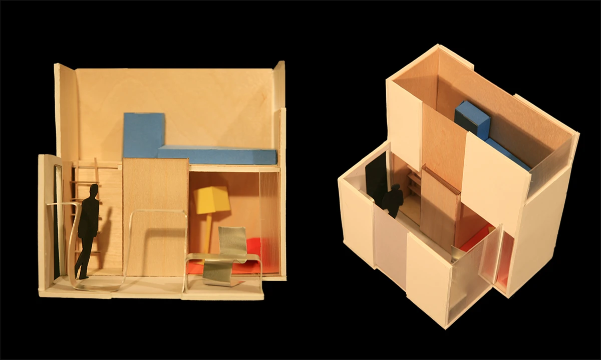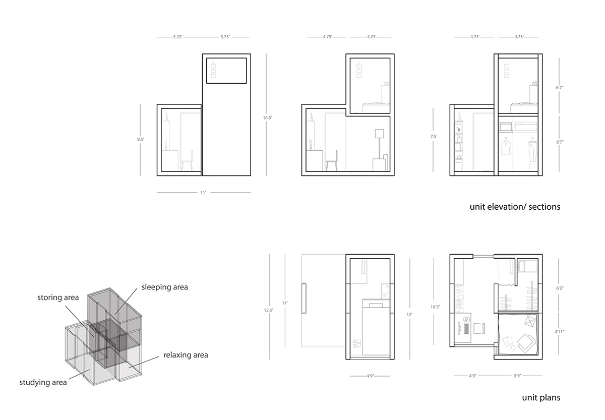 从尊重个体的需求入手,我们对个体的居住单体进行了多种方案的设计,最终选择具有多种组合性的L形空间。纵向L型的居住单元可以为每个学生提供平等的居住环境。麻雀虽小五脏俱全,通过紧凑的空间排布,每个unit都包含了学习空间、休闲空间、储物间和卧室。受占地面积限制,空间采取纵向延伸的方式,卧室位于unit上部,需要通过一个小小的梯子爬上去。剖面空间的变化使单个Unit如同拥有了套间,大大增加了空间的丰富性与趣味性,并使得有限面积的空间不显得过于局促。空间的规划与分隔也使学生的个人物品都有合适的位置进行摆放,室内环境不再杂乱无章。