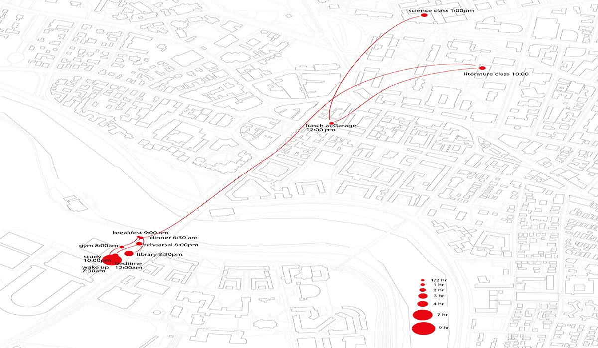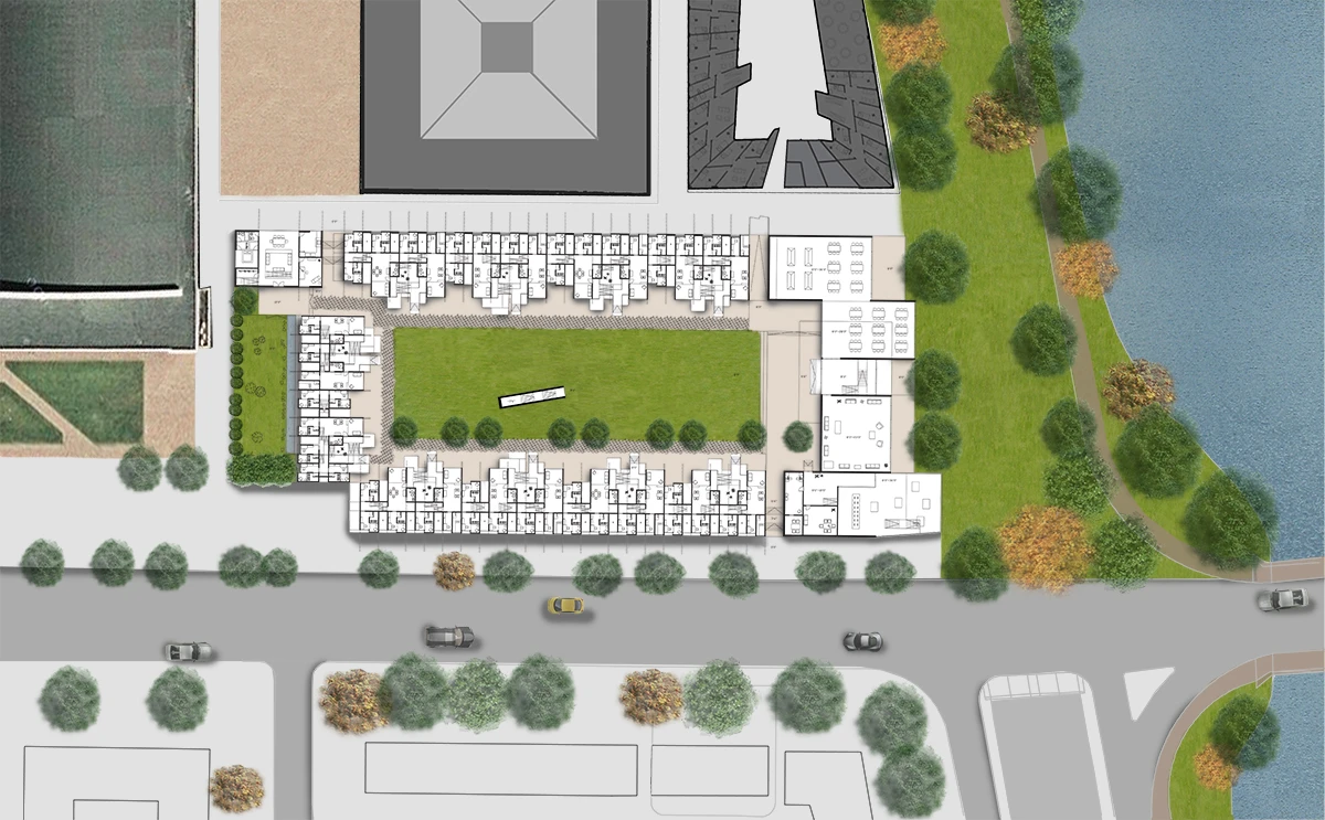建筑占据场地的四周,中央形成一个开阔的内院作为供所有学生使用的公共活动场所。四面围合的形式也保证了House相对于外界的私密性。Unit布置在场地最外围,利于居住单体的采光。又由于面向校园环境,故其界面不同于形式复杂的内院界面,外立面排列整齐且富有肌理,以期与周边的校园建筑相协调,并赋予校园建筑的秩序感。学生从公共活动丰富、人群聚集最为热闹的内院进入Cluster的入口,在每一层都有个形态太不一的入口空间进入Suite到达2至4个学生共享的客厅,Suite内的Unit也并非围绕客厅简单地平面展开,有时需要向上半层进入某个居住单体。因此与其说一个Suite是一间Apartment,不如说它是一幢微缩的House。于是从内院一直进到卧室,是一个从公共空间经过半公共空间最终到达私密空间的过程,是一个从无序、混杂分流到有序、单独的过程,是一个从繁杂、多样整理到整齐、统一的过程。学生在此可以和其他人进行多样的交流与互动,最终还是可以回归到独处与对自我的认知。