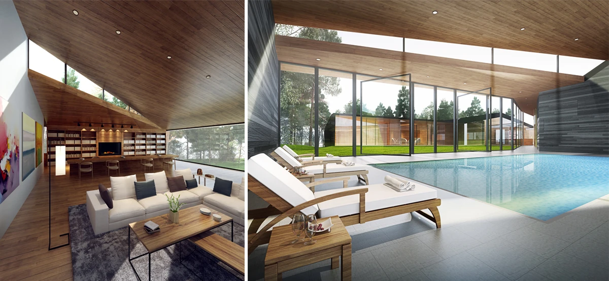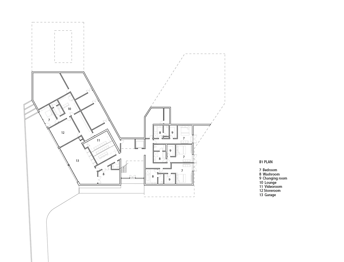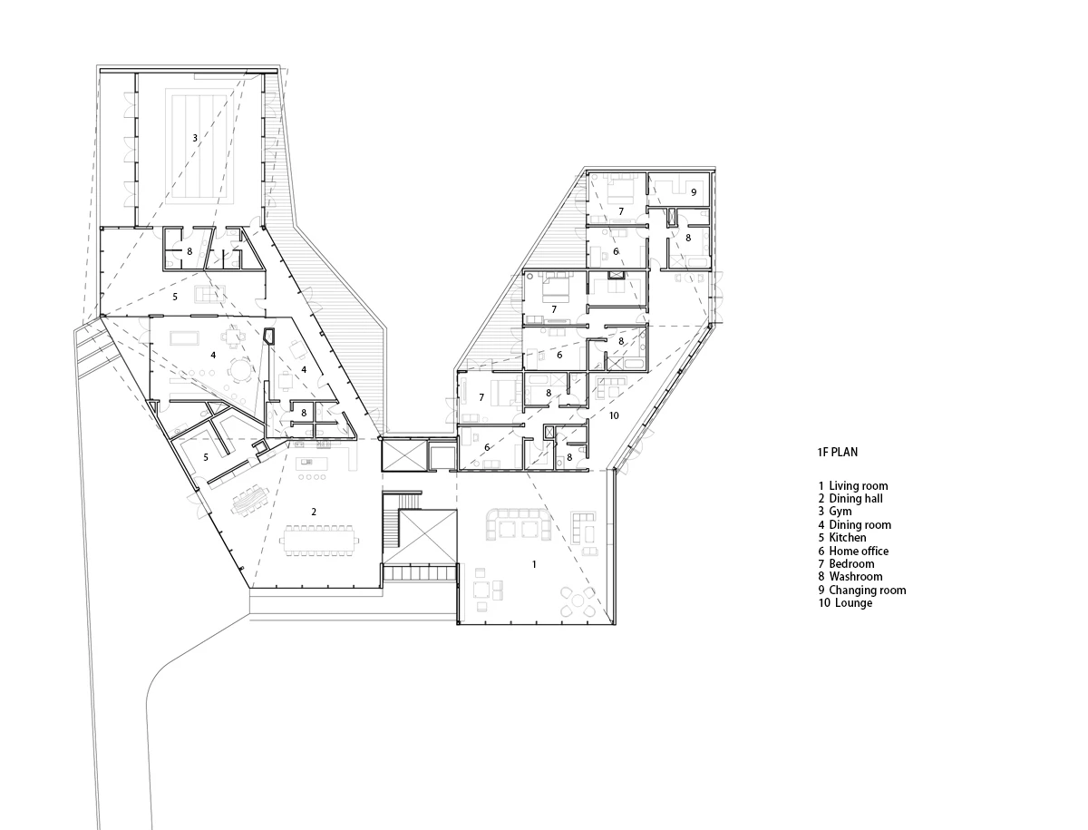 设计利用地形划分功能区域,将主要的生活区放置在一层,其余辅助区放置在地下室,如车库。因存在近一层高的自然地势落差,地下室北侧与土壤想接,一层生活区域往北延伸并围绕成一个半开敞的庭院。后根据功能分区以及流线控制的需要将建筑主体分为两个单体,其用可观景的玻璃走廊连接,私密空间放置北侧,毗邻中庭,可以观赏到隐逸的树林,营造出一种非常宁静优雅的气氛。活动区域放置南侧与私密空间对望,分明的功能划分使得室内空间得以充分利用并很融洽的与屋外环境相融合。使得业主既能感受到自然的气氛又能远眺开阔的湖面,让人在一种愉快而放松的状态下交流,生活。