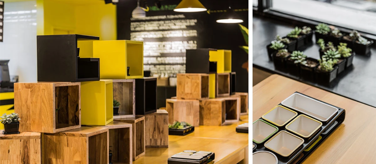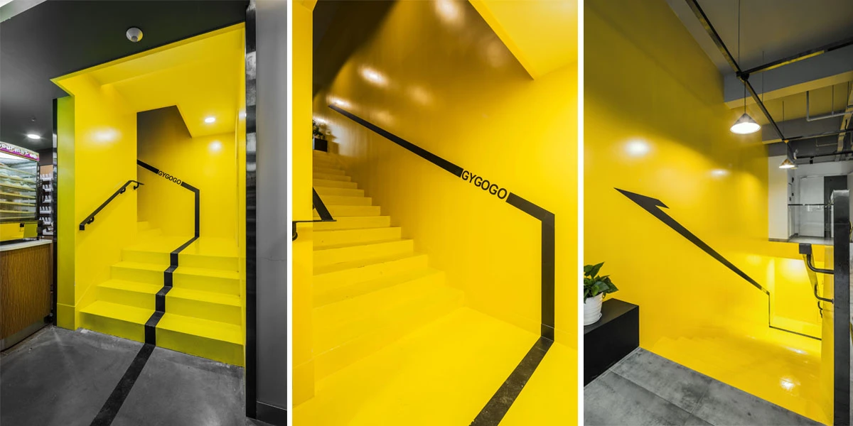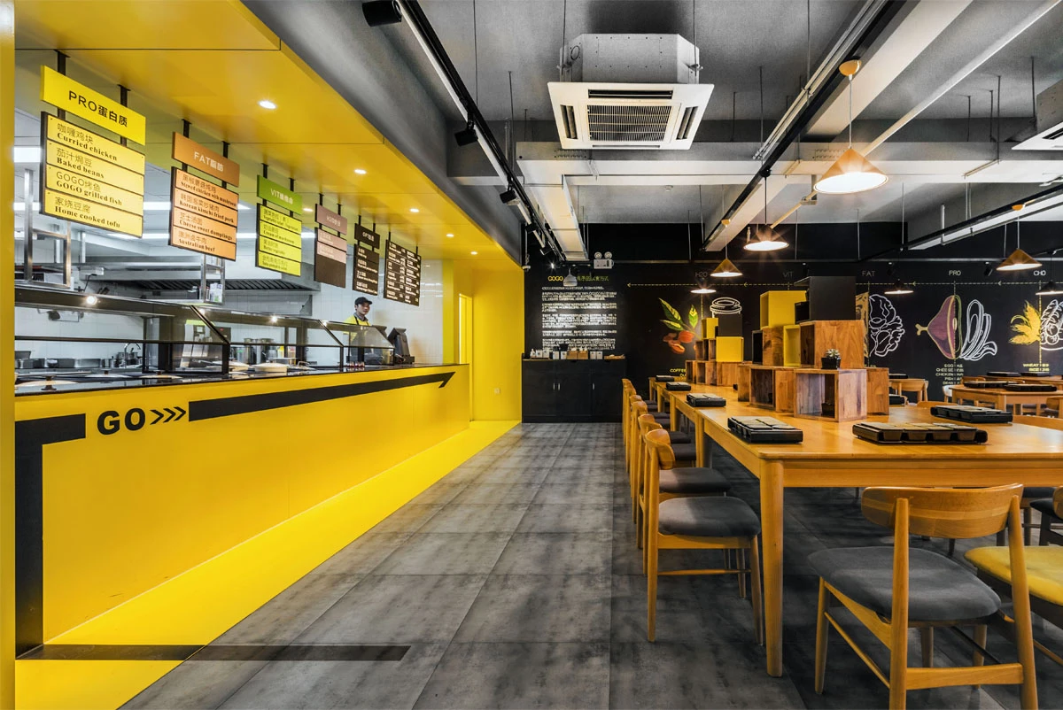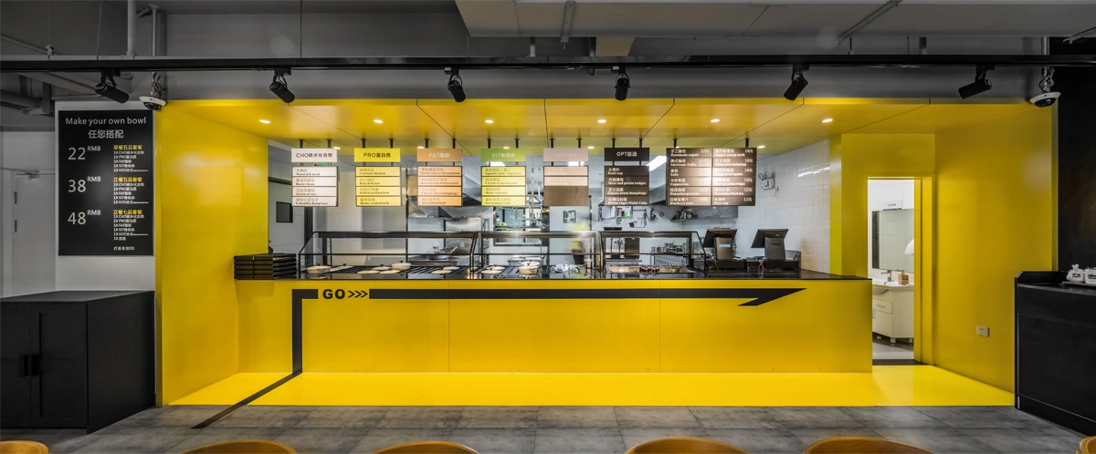 GYGOGO生态餐厅设计是把室内空间、视觉、餐具串联成一条指引性用餐行为的动线,它主动引导顾客去发现不同的空间区域,由餐厅内部的流线性指引用黄色墙底贯穿线连接室内,底部超市,就餐区以及到室外。指引顾客到达所想去处和目标窗口。其就餐区域是全开放式取餐模式,给备餐人员和顾客提供无障碍的互动交流平台。